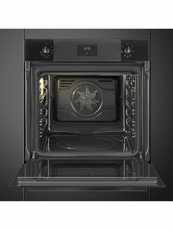 Встраиваемый духовой шкаф SMEG SF6100VB3RU (серия Linea) — модель шириной 60 см в элегантном исполнении из чёрного стекла. Прибор сочетает современный дизайн и функциональность, подходит для полноценной кулинарной работы на кухне.Температурный режим и объёмДуховой шкаф поддерживает температуру в диапазоне от 50 °C до 250 °C. Полезный объём камеры составляет 70 л, что позволяет готовить крупные блюда — например, целую птицу или большие куски мяса.Режимы приготовленияУстройство предлагает 6 режимов работы: статический, вентилируемый, ECO, большой гриль, большой гриль с конвекцией и нижний нагрев с конвекцией. Это даёт возможность подбирать оптимальный способ приготовления для разных блюд.Управление и дисплейУправление осуществляется с помощью поворотных переключателей Linea. LED‑дисплей DigiScreen обеспечивает наглядную индикацию настроек. Удобный таймер и функция быстрого предварительного разогрева упрощают процесс готовки.Освещение и отделкаВнутри камеры установлена галогенная подсветка, которая хорошо освещает пространство при приготовлении. Внутренняя поверхность покрыта эмалью Ever Clean — она устойчива к загрязнениям и облегчает очистку духовки. Дверца имеет трёхслойное остекление, повышающее безопасность эксплуатации.Энергоэффективность и безопасностьМодель относится к классу энергоэффективности A. Функция ECO позволяет снизить энергопотребление. Духовой шкаф оснащён системой тангенциального охлаждения и автоматическим отключением при открытой дверце, что повышает безопасность использования.