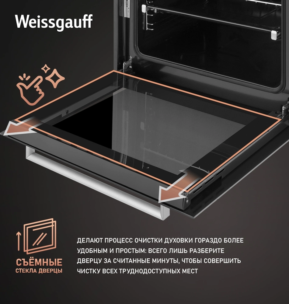 • Полностью стеклянная внутренняя поверхность дверцы духовки: ДА