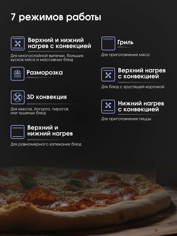 - Режимы: верхний нагрев + конвекция, верхний нагрев + нижний нагрев, верхний нагрев + нижний нагрев + конвекция, гриль, нижний нагрев + конвекция, кольцевой нагрев с конвекцией, разморозка