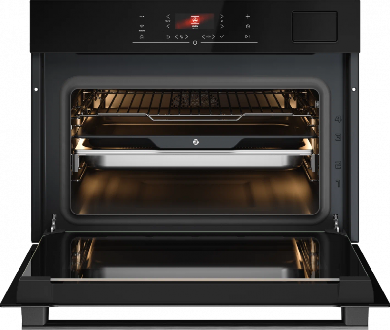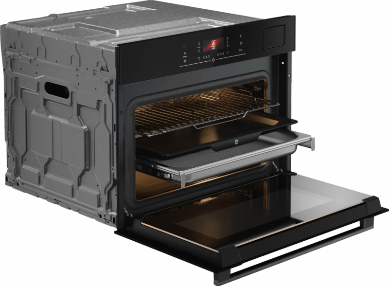 Подробная комплектация: 1 противень из нержавеющей стали без перфорации / 1 противень из нержавеющей стали с перфорацией / 1 решетка / 1 универсальный противень / Термозонд