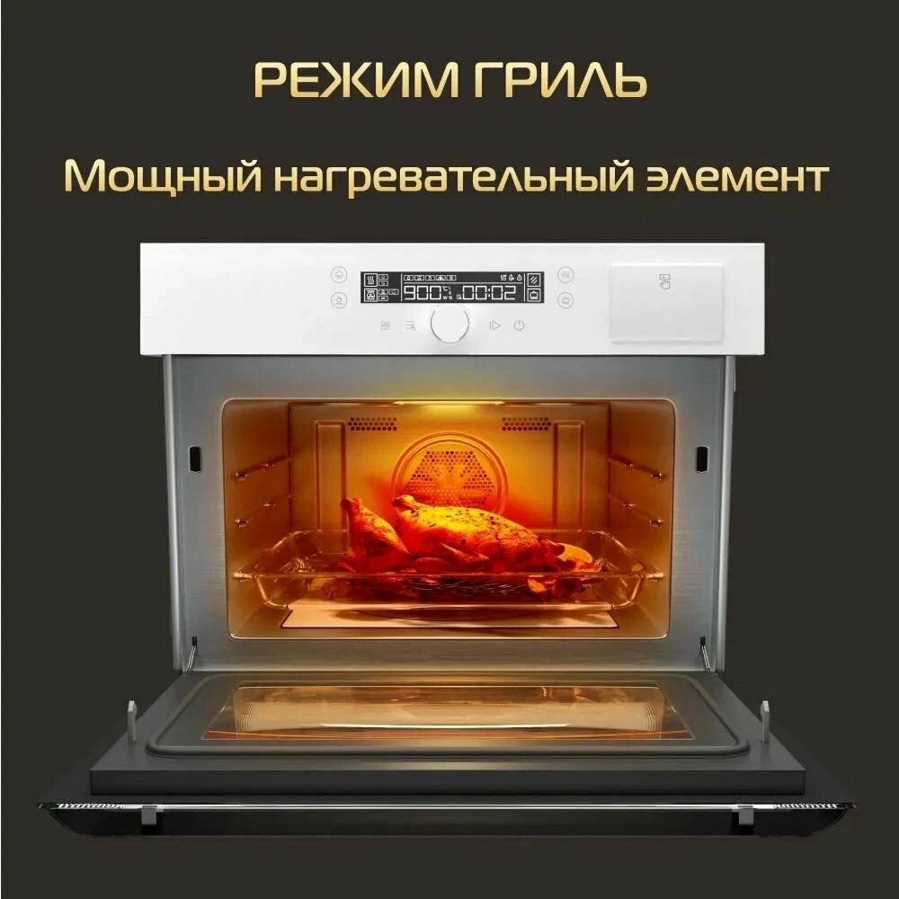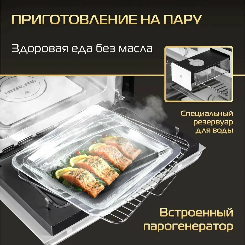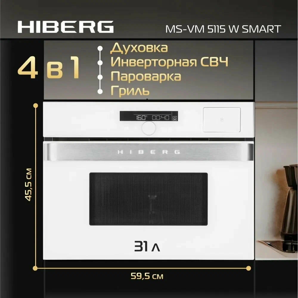 Встраиваемый духовой шкаф HIBERG MS-VM 5115 W SMART с функцией готовки на пару, грилем, разогревом блюд с помощью микроволн, сенсорной панелью с запрограммированными рецептами — это уникальное устройство, созданное для комфортного приготовления и настоящих кулинарных шедевров!Стеклянный фасад духового шкафа черного цвета в сочетании с большой LED-панелью подчеркивает эксклюзивность модели.Духовой шкаф объемом 31 литр идеально подходит для встраивания в гарнитур в небольшом кухонном пространстве. Максимальная мощность 2000 Вт обеспечивает быстрый нагрев и позволяет достичь желаемой температуры для приготовления блюд.Внутренние боковые стенки камеры выполнены из нержавеющей стали, а дно — из стеклокерамики.Лаконичная сенсорная панель управления с большим LED-дисплеем обеспечивает понятное и комфортное пользование всеми режимами и функциями модели. Сенсорные кнопки и регулятор позволяют легко настроить все параметры приготовления и воспользоваться дополнительными функциями. Система рецептов в автоменю избавляет от необходимости угадывать, какую температуру и время приготовления установить: просто выберите необходимый рецепт на дисплее.Режимы и функцииДуховой шкаф, объединяющий в себе функции пароварки и СВЧ, поддерживает 7 режимов работы, имеет 7 дополнительных функций и 51 программу с предустановленными настройками, которые позволяют приготовить все, что только пожелаете.Диапазон рабочих температур в духовом шкафу: 38–230 °C.Приготовление на паруЭто прекрасная возможность получить вкусную и полезную еду — рыбу, мясо, паровые котлеты из курицы или индейки, гарниры и овощи — без использования масла. Для этого нужно добавить воду в специальный резервуар до максимальной отметки и выставить необходимый режим приготовления на пару. Кроме пользы для здоровья, варка на пару экономит время, так как блюдо никогда не пригорит и готовится равномерно. Любая выпечка, приготовленная с помощью пара, получается просто изумительной. Мясо, рыба и овощи идеально пропекаются со всех сторон и приобретают золотистую хрустящую корочку, оставаясь сочными внутри и сохраняя все полезные свойства.Добавление пара к другим вариантам нагрева позволяет сделать блюда более сочными и ароматными, а также избежать их пересушивания.МикроволныБлагодаря режиму «Микроволны» можно быстро и легко разогреть любимые блюда прямо в духовом шкафу. Устройство, объединяющее в себе функции микроволновой печи и духовки, экономит пространство на кухне.Режим «Микроволны» может использоваться как отдельная программа для разогревания блюд, так и совместно с другими режимами нагрева: пар и микроволны, гриль и микроволны. Это позволяет готовить широкий спектр блюд — от простых закусок до сложных десертов — и все с помощью одного устройства.
