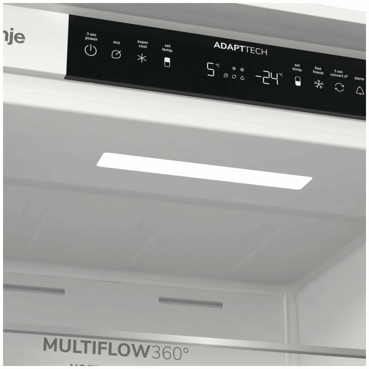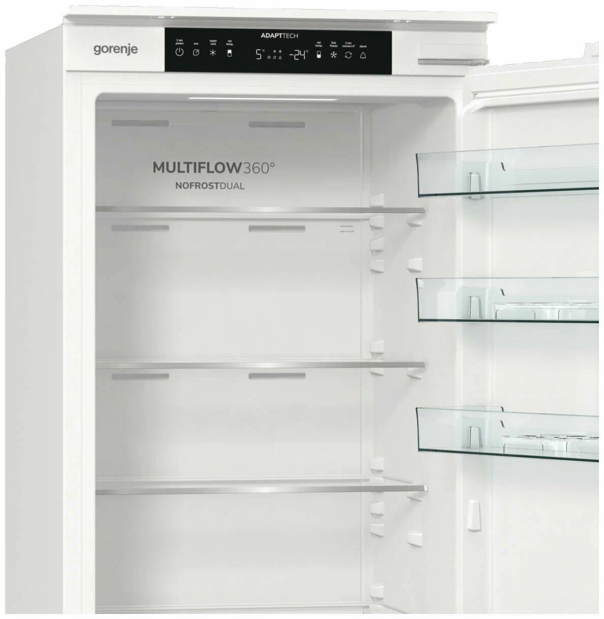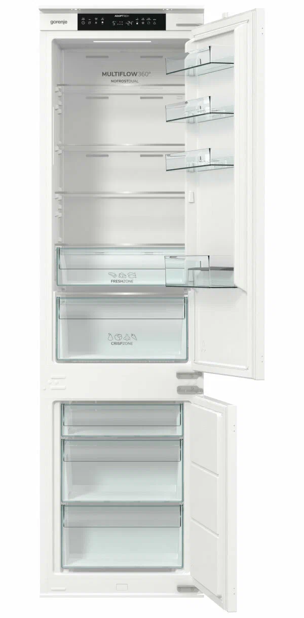 Одной из ключевых особенностей холодильника Gorenje NRKI5191 является адаптивная технология охлаждения AdaptTech. Эта интеллектуальная система анализирует время и частоту открытия холодильника и на основании этих данных выстраивает алгоритм работы, поддерживая оптимальную температуру внутри. Это помогает избежать резких перепадов температуры и нагрева продуктов при открытии дверцы. Внутреннее пространство холодильника эффективно организовано: 5 полок из закаленного стекла, регулируемые по высоте, позволяют разместить продукты различных размеров, а специальный контейнер для овощей и фруктов помогает поддерживать их свежесть дольше.