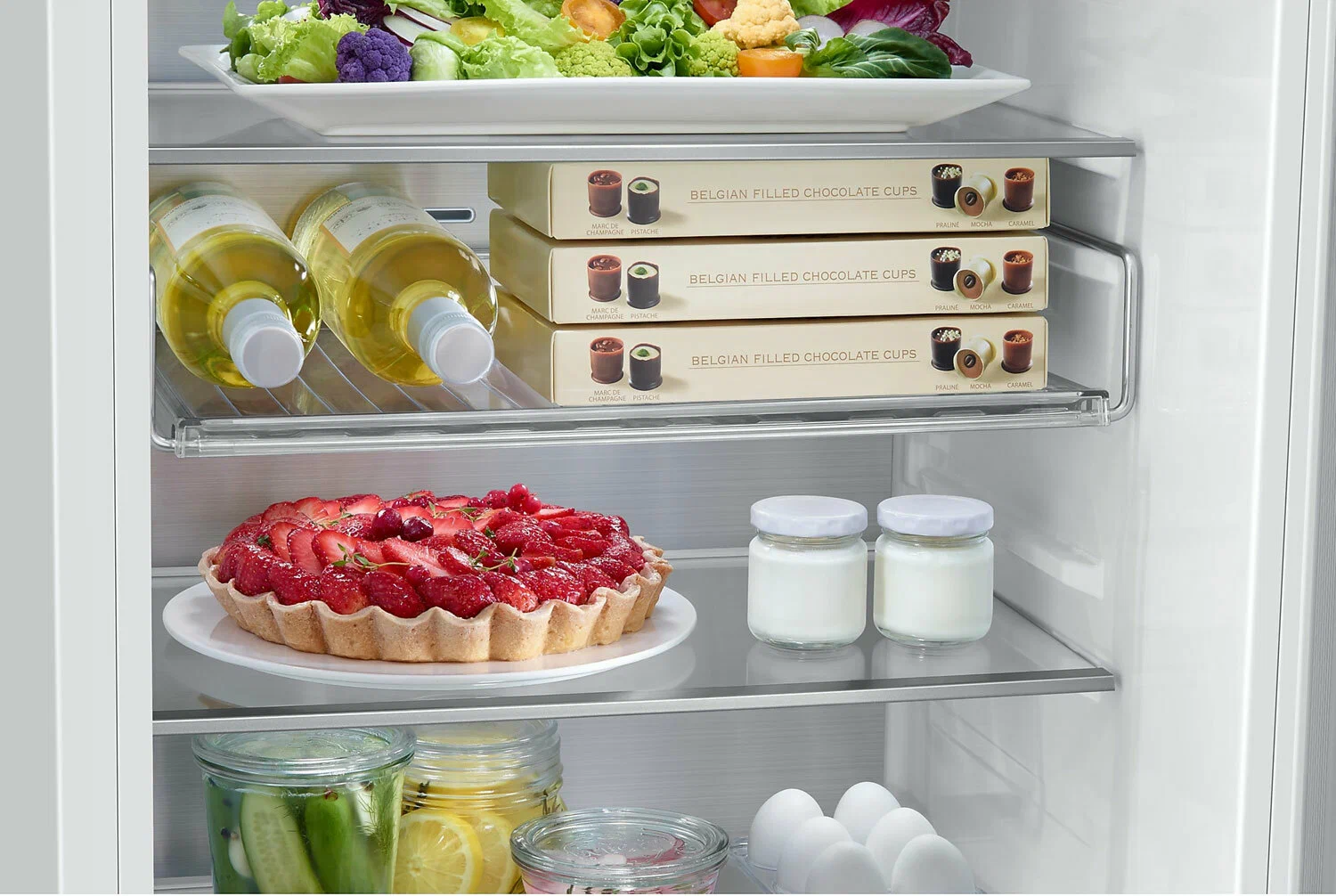 Более эффективно используйте пространство в дверце холодильника, чтобы хранить там больше продуктов. Конструкция Variety Guard позволяет легко отрегулировать и удобно расположить до 5 дверных полок, чтобы вы могли эффективно расставлять и хранить различные предметы разного размера.