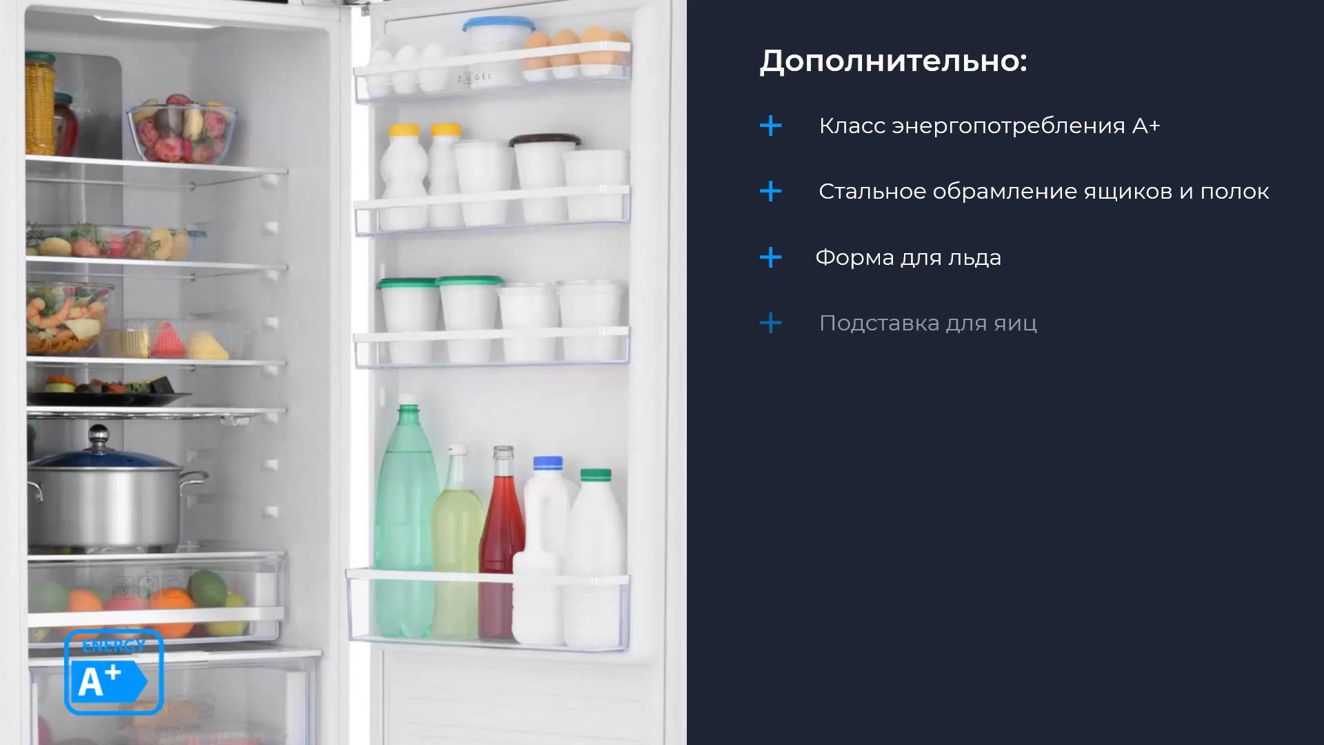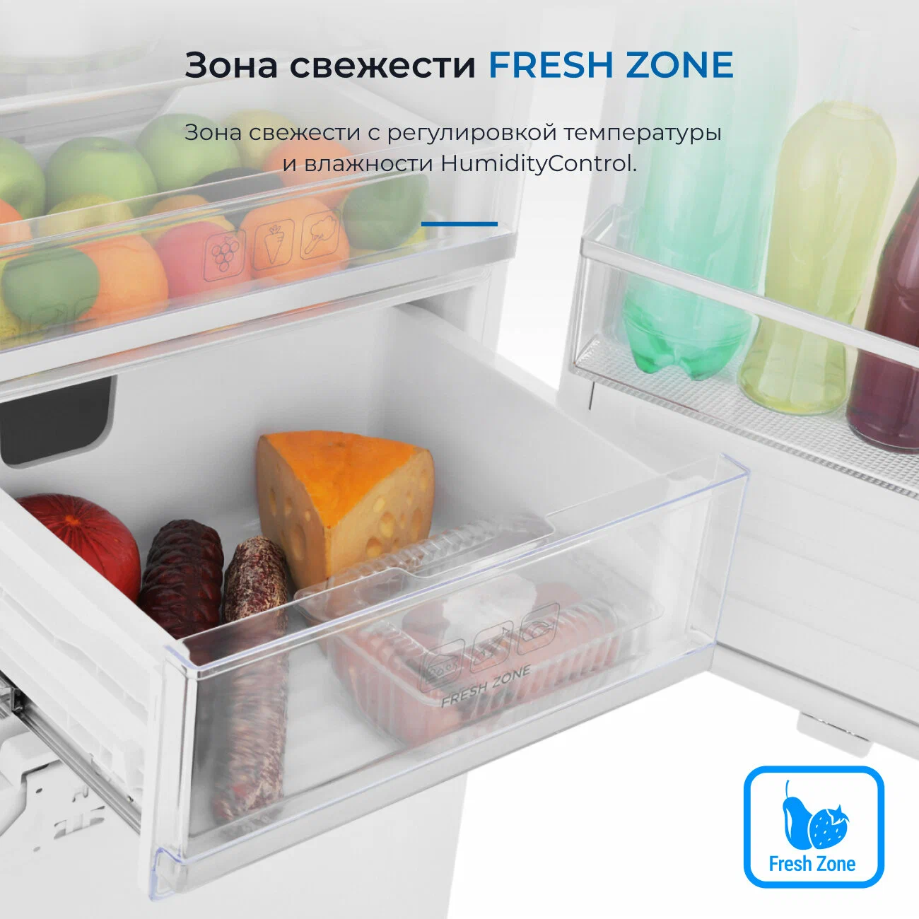 Дополнительная информация: Зона свежести(FreshZone) с регулировкой температуры , Регулятор уровня влажности HumidityControl в зоне свежести, Металлическая задняя стенка (MetalCooling) для дополнительного охлаждения и быстрого восстановления температуры в отделении при открывании две