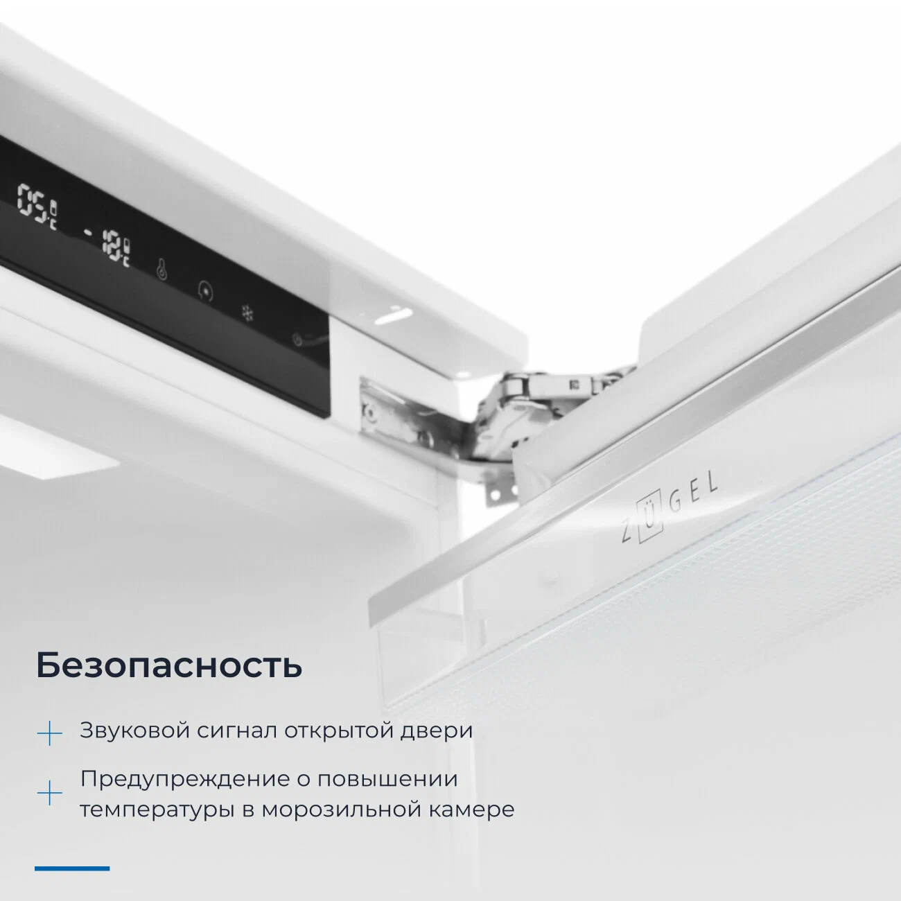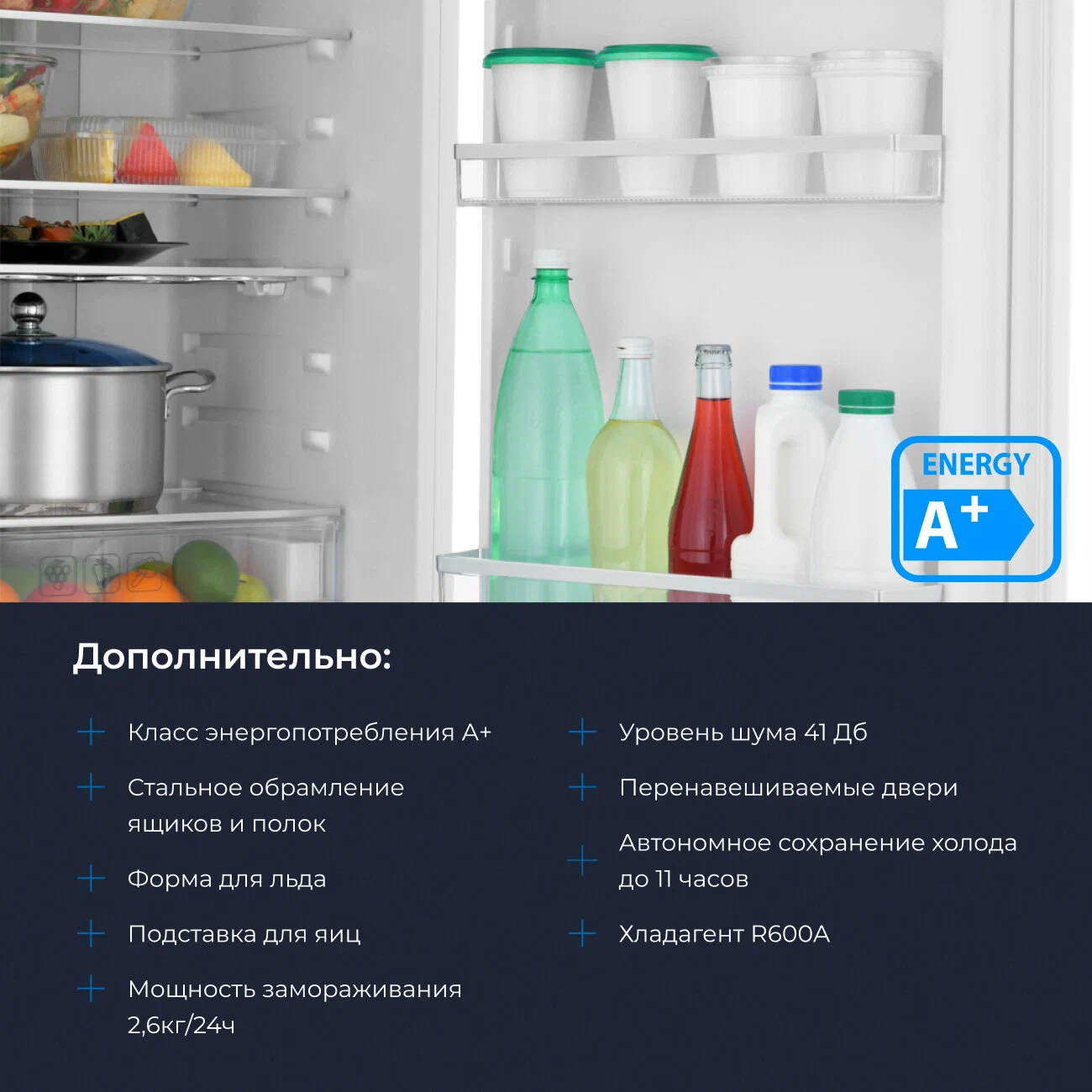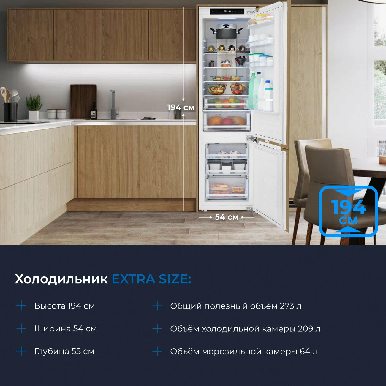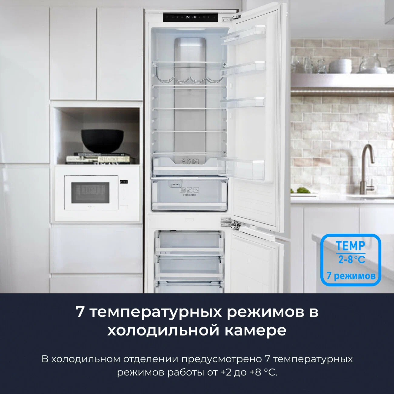 Тип: встраиваемый холодильник; Морозильная камера: снизу; Размораживание холодильной камеры: No Frost; Размораживание морозильной камеры: No Frost; Тип компрессора: инверторный; Тип управления: электронное; Мощность замораживания: 2.6 кг/сутки; Автономное сохранение холода: 11 ч;