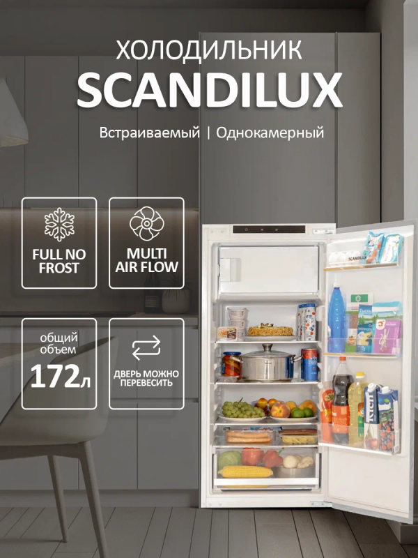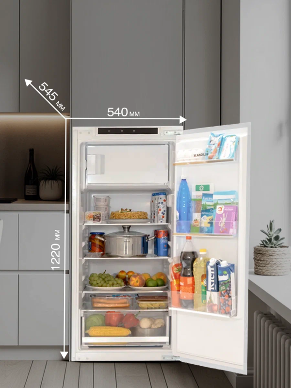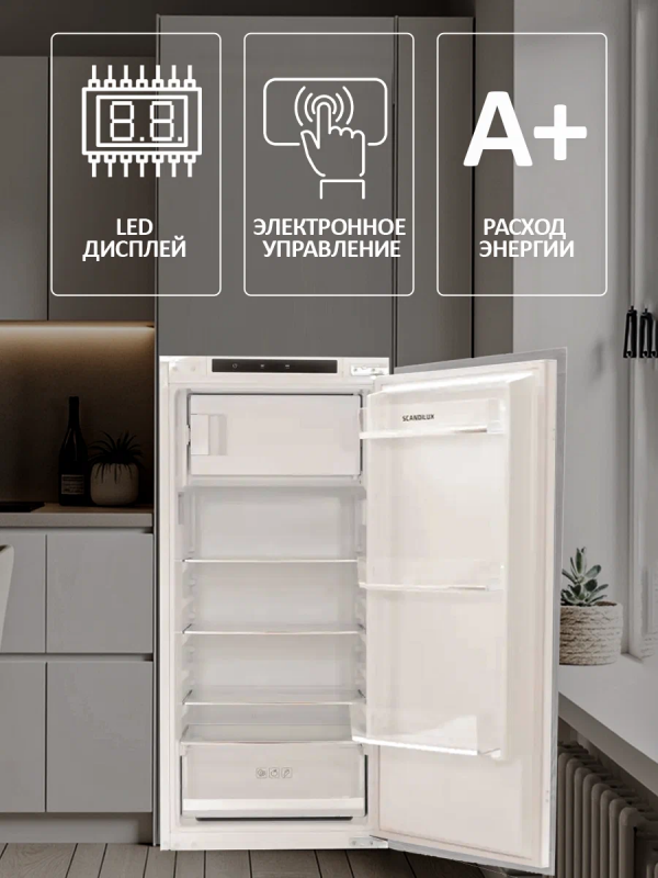 Встраиваемый однокамерный холодильник SCANDILUX RBI188 — это компактное и надежное решение для тех, кто ищет встраиваемый однокамерный холодильник с низким энергопотреблением и удобным управлением. Он сочетает в себе высокую энергоэффективность, современный дизайн и богатую функциональность, что делает его идеальным выбором для вашей кухни.Scandilux – это европейский бренд, известный своими инновационными решениями в сфере бытовой техники. Компания придерживается высоких стандартов качества, предоставляя своим покупателям продукцию, которая сочетает в себе функциональность, стильный дизайн и долговечность. Вся техника Scandilux разрабатывается с акцентом на экологичность, надежность и удобство, что делает её идеальным выбором для тех, кто ценит комфорт и безопасность в быту.Габариты и объем. Размеры устройства: 122 см в высоту, 55.5 см в ширину и 54.5 см в глубину, что делает его отличным вариантом для небольших кухонь и встроенных гарнитуров.Общий объем холодильника составляет 188 литров, что позволяет комфортно хранить продукты.Энергоэффективность класса A+. Модель относится к классу A+, что означает низкое энергопотребление и экономию на электричестве, обеспечивая долговечную и эффективную работу.Климатический класс SN-ST. Подходит для эксплуатации при температуре от +10°C до +38°C, что делает его универсальным для большинства климатических условий.SCANDILUX RBI188 работает практически бесшумно, что гарантирует комфорт при использовании даже в небольших помещениях.Электронное управление. Простая и надежная система электронного управления позволяет легко регулировать температуру внутри холодильника.Встроенное освещение. LED-подсветка обеспечивает яркий и равномерный свет, позволяя удобно находить продукты даже при минимальном освещении в помещении.Перевешиваемые двери. Холодильник оснащен функцией перевешивания дверей, что дает гибкость при установке и позволяет адаптировать его к любой кухонной планировке.Дополнительные функции и комплектация. Лоток для яиц – удобное хранение яиц в комплекте, просторные полки – для оптимального размещения продуктов.SCANDILUX RBI188 — это функциональный, тихий и экономичный встраиваемый холодильник, который станет отличным выбором для маленьких кухонь, гостиниц или офисов.