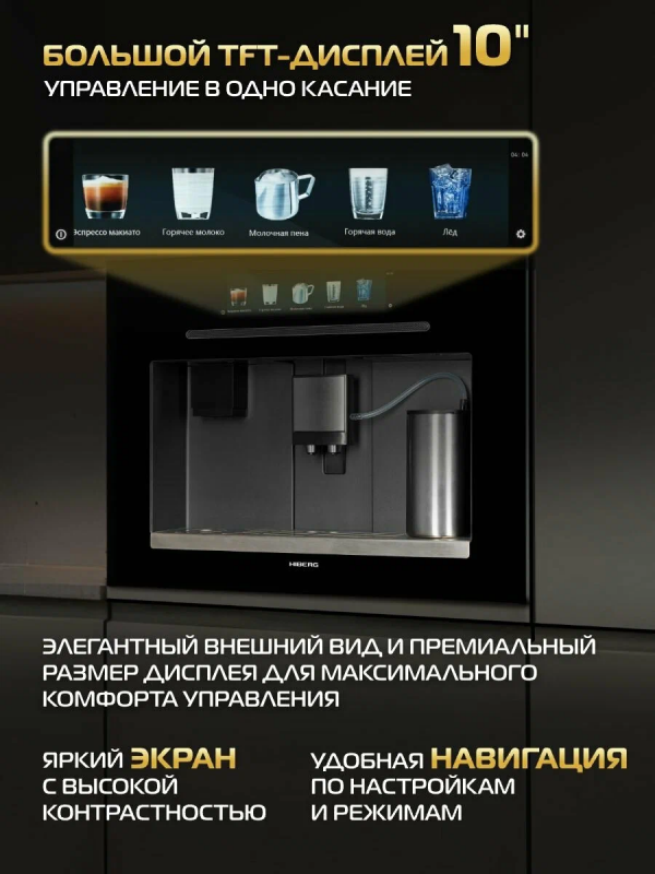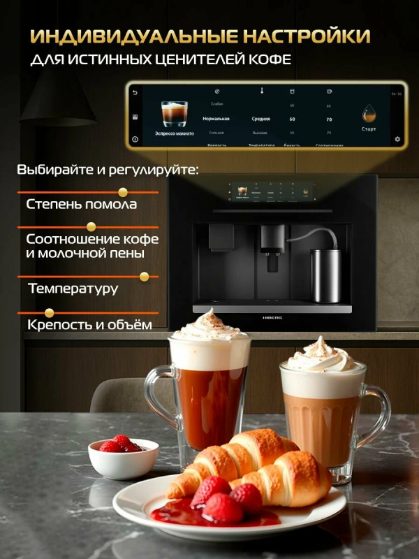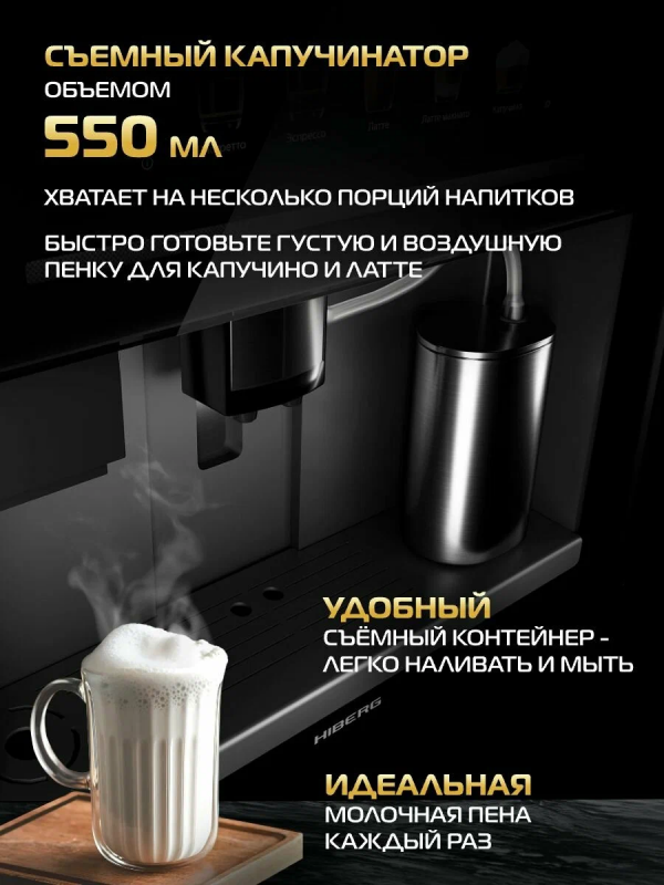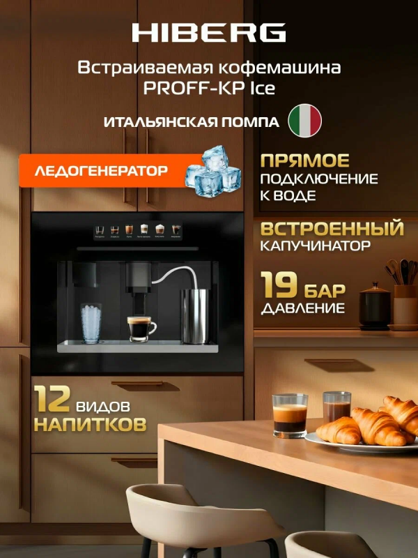 Встраиваемая кофемашина HIBERG PROFF-KP Ice с ледогенератором создана для тех, кто ценит не только вкус, но и атмосферу момента. Будь то утро на вашей кухне, перерыв в домашнем офисе или встреча друзей в зоне отдыха, HIBERG PROFF-KP Ice превращает приготовление напитков в настоящую кулинарную церемонию.Технологии премиального уровня и эстетика современной кухниЭлегантный фасад из цельного закаленного стекла и металлические элементы из нержавеющей стали идеально дополняют современный интерьер. За стильной внешностью автоматической кофемашины скрываются мощные возможности: итальянский заварочный блок, встроенный ледогенератор и подключение к водопроводу делают модель незаменимым спутником вашего дня.Интуитивное управление и персонализация каждого напиткаЦветной TFT-дисплей с сенсорным управлением реагирует на легкое прикосновение, открывая доступ к индивидуальным настройкам: вы сами выбираете объем напитка, крепость, температуру и даже уровень жесткости воды. Благодаря системе Aroma Double Shot каждый глоток будет насыщенным и ярким — идеальный вкус с двойным акцентом на аромате.Кофе, который пробуждает. Лед, который освежаетИтальянская помпа зерновой кофемашины с давлением 19 бар раскрывает богатство вкуса и аромата каждого зерна. Встроенный ледогенератор с производительностью до 15 кг льда в сутки позволит экспериментировать и создавать летние кофейные вариации и освежающие напитки без лишних хлопот.Максимум удобства, минимум заботКонтейнер для кофейных зерен на 500 г, подключение к водопроводу и регулировка степени помола избавляют от необходимости постоянно следить за процессом. Прочные детали из нержавеющей стали гарантируют надежность даже при интенсивной эксплуатации, а автоматическая самоочистка капучинатора заботится о гигиене устройства.12 автоматических программ — вдохновение для каждого дня:классические и крепкие кофейные напитки; • рецепты с добавлением молока; • взбитая молочная пена и подогрев молока; • горячая вода для чая; • функция заморозки льда.Модель HIBERG PROFF-KP Ice не просто техника, это стиль жизни, в котором каждый напиток — маленький повод для удовольствия.Технические особенности автоматической зерновой кофемашины:встраиваемая конструкция идеально вписывается в кухонный гарнитур;мощность 1550 Вт;итальянская помпа с давлением 19 бар;контейнер для зерен на 500 г;подключение к системе водоснабжения;встроенный ледогенератор производительностью до 15 кг льда в сутки;регулировка степени помола и температуры;настройка объема и крепости напитка;регулировка жесткости воды;система Aroma Double Shot для насыщенного вкуса;12 автоматических программ;TFT-дисплей с сенсорным управлением;элементы из нержавеющей стали;автоматическая самоочистка капучинатора;энергосберегающий режим.Гарантия кофемашины — 2 года.Встраиваемая автоматическая кофемашина HIBERG — ваш ежедневный ритуал вкуса и стиля.