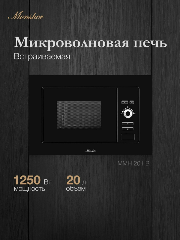 Микроволновая печь Monsher MMH 201 B — это современная встраиваемая модель, которая подойдёт для использования в шкафу или колонне. Она оснащена микроволнami мощностью от 800 до 1250 Вт и грилем мощностью 1000 Вт. Печь имеет 5 уровней мощности и 8 автоматических программ. Размораживание возможно по весу или времени. Управление полностью электронное и сенсорное.Среди других особенностей — многофункциональный таймер, часы, блокировка от детей, а также внутренняя поверхность камеры из нержавеющей стали. Объём камеры составляет 20 литров, а поворотный стол имеет диаметр 24,5 см. В комплекте также идёт решётка для гриля.