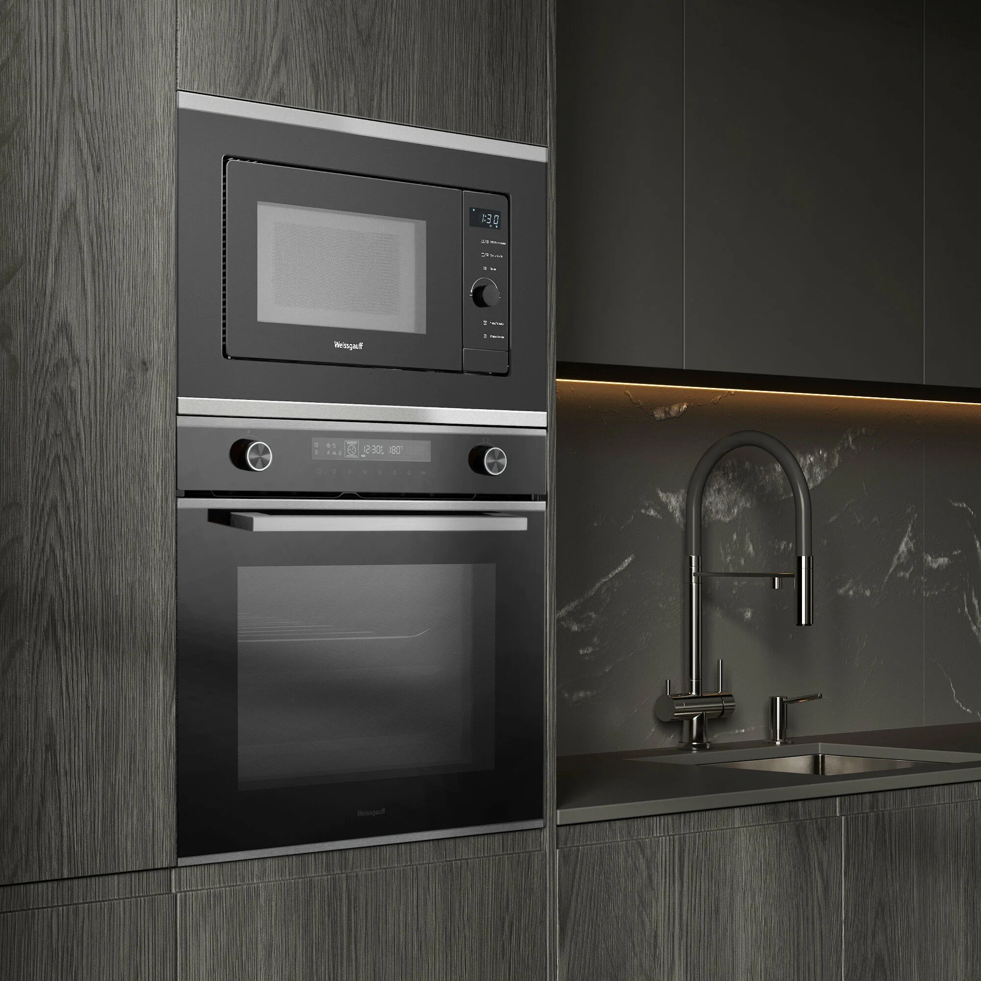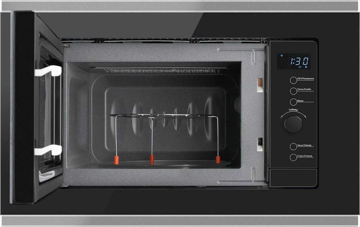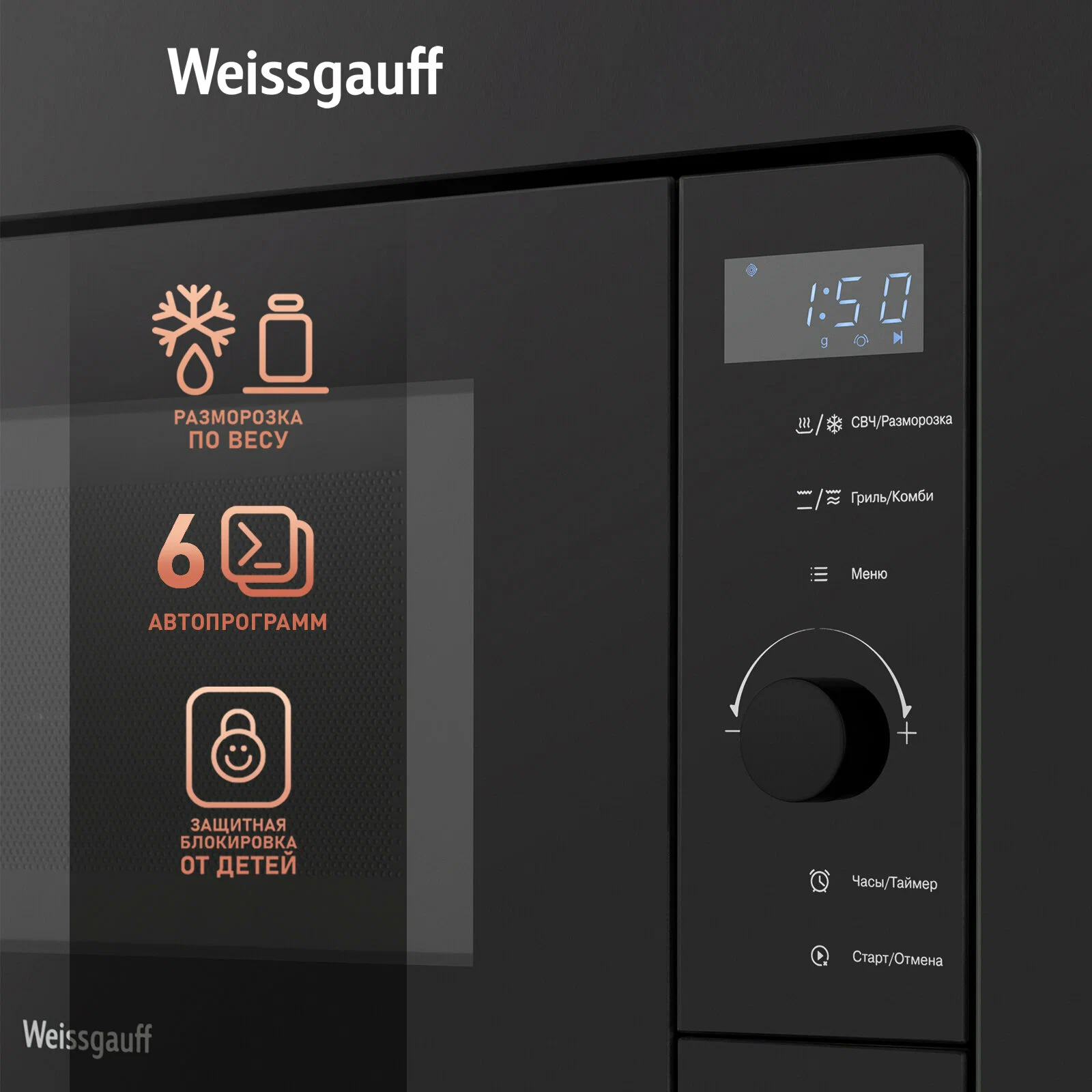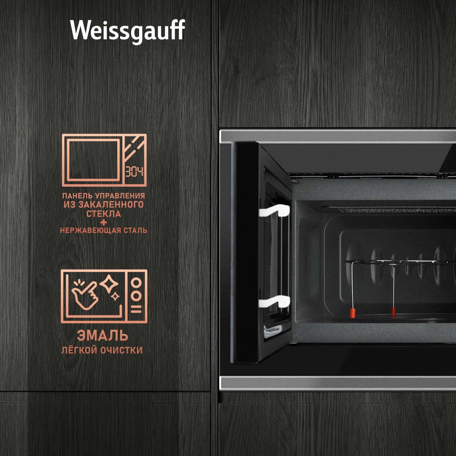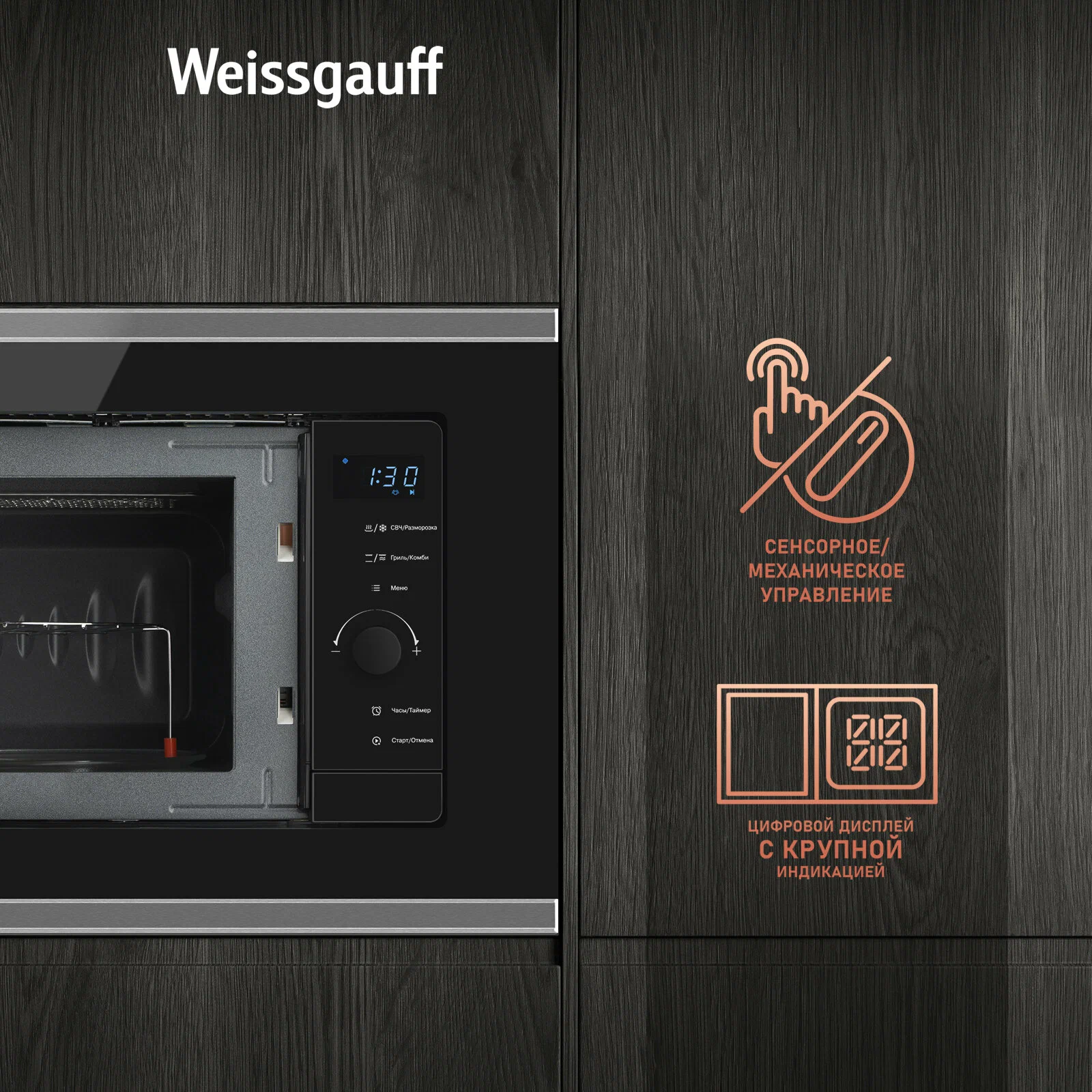Встраиваемая микроволновая печь Weissgauff с объемом 20 литров, выполненная в сочетании нержавеющей стали и черного закаленного стекла, равномерно разогревает еду при помощи поворотного стола, а также оснащена грилем с возможностью работы в комбинированном режиме и набором программ автоменю! Объем 20 литров дает вам полную уверенность в том, что вы сможете разместить в ней сразу весь необходимый объем пищи! Поворотный стол диаметром 245 мм не только обеспечивает равномерный прогрев блюда со всех сторон, но и удобно извлекается из камеры, делая легкими его очистку и уход Камера из нержавеющей стали воплощает в себе надежность и качество, ведь её стенки прочные, устойчивые к перепадам температур и механическим воздействиям, а также легко отмываются от возникающих загрязнений Автоменю на 6 программ открывает по-настоящему богатые возможности по настройке вашей микроволновой печи под требуемые особенности продуктов, включая такие режимы как Рис, Овощи, Мясо, Паста, Рыба и Разогрев! Встроенный гриль - позволит готовить вам аппетитное мясо, рыбу или овощи, поджаренные до хрустящей корочки! Комбинированные режимы - при которых микроволны и гриль работают вместе, дополняя друг друга, открывают еще больше возможностей по приготовлению в данном устройстве! Разморозка по весу - позволит подготовить замороженные продукты к дальнейшему приготовлению, обеспечивая равномерный результат без перегретых краев или непроработанных участков внутри. Блокировка от детей, благодаря которой вы всегда сможете избежать ненужных нажатий на элементы управления, например, во время уборки микроволновой печи или, чтобы предотвратить её незапланированное включение детьми. Сочетание сенсорного и механического управления - это настоящая гордость Weissgauff, ведь сенсорный блок не только является интуитивно понятным, но и великолепно реагирует на прикосновения с первого нажатия даже в том случае, если ваши руки влажные или прохладные, а механический поворотный элемент невероятно отзывчив и удобен в обращении. Удобный цифровой дисплей с крупной индикацией позволит сделать процесс взаимодействия с микроволновой печью еще более комфортным и простым Дизайн, выполненный в закаленном стекле, станет финальным штрихом в совершенстве великолепного облика этой модели. Каждый раз, взаимодействуя с вашей микроволновой печью от Weissgauff, вы будете чувствовать, что это не только функциональное устройство, но и настоящее украшение вашей кухни!
