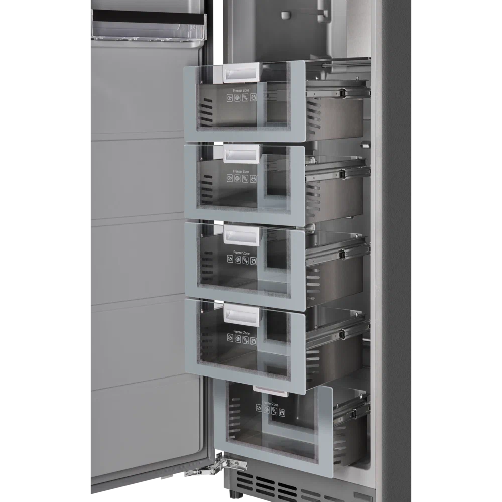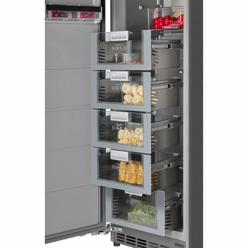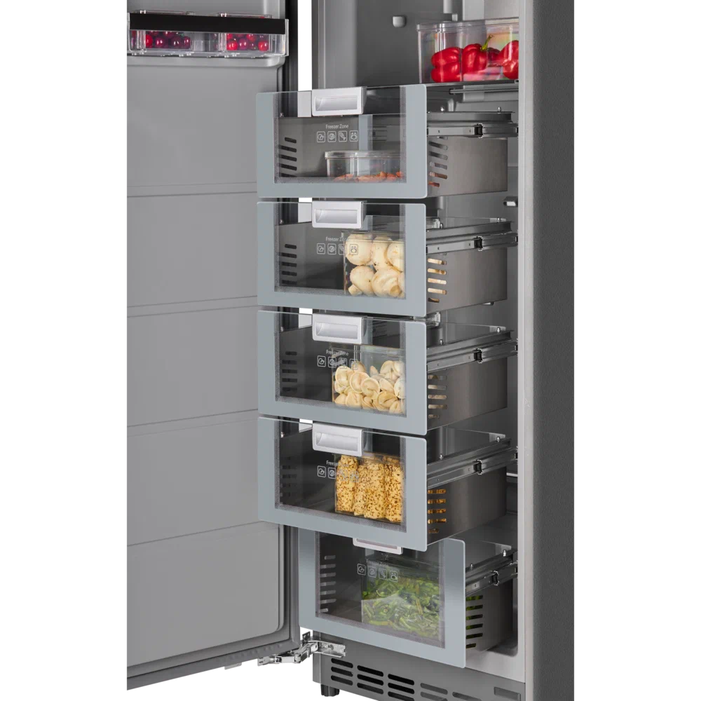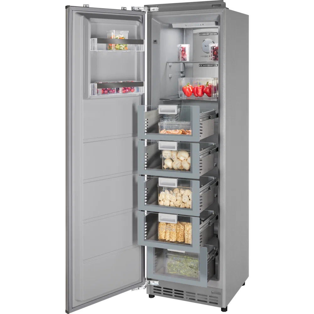 Уникальность морозильника в том, что его высота составляет 187 см. Он идеален для встраивания в кухонный гарнитур в домах или квартирах с высокими потолками.