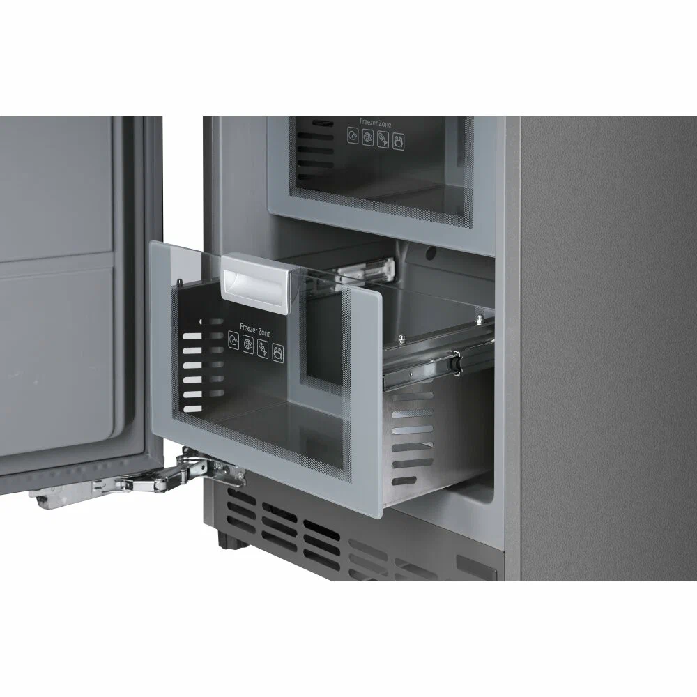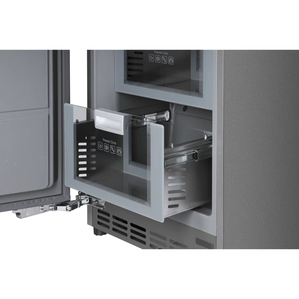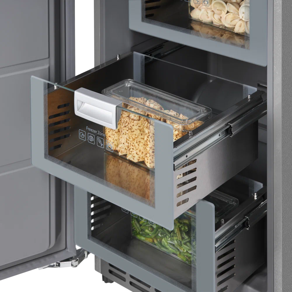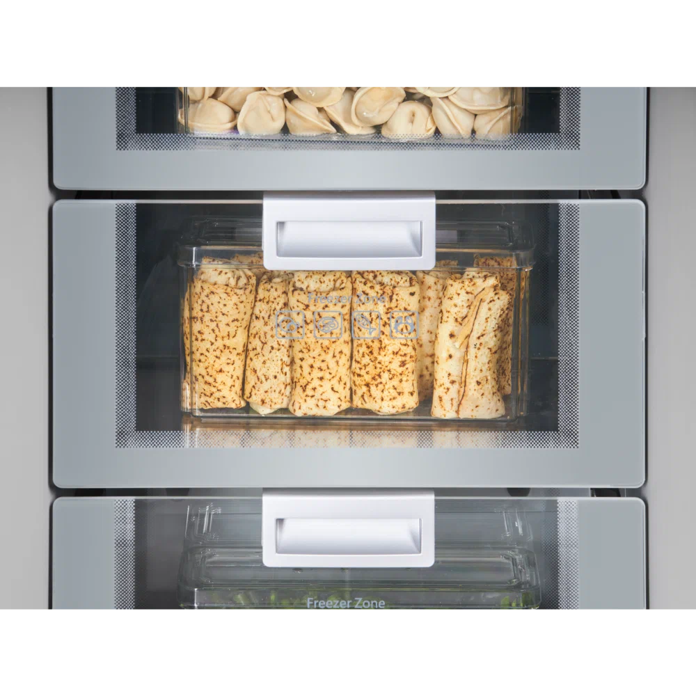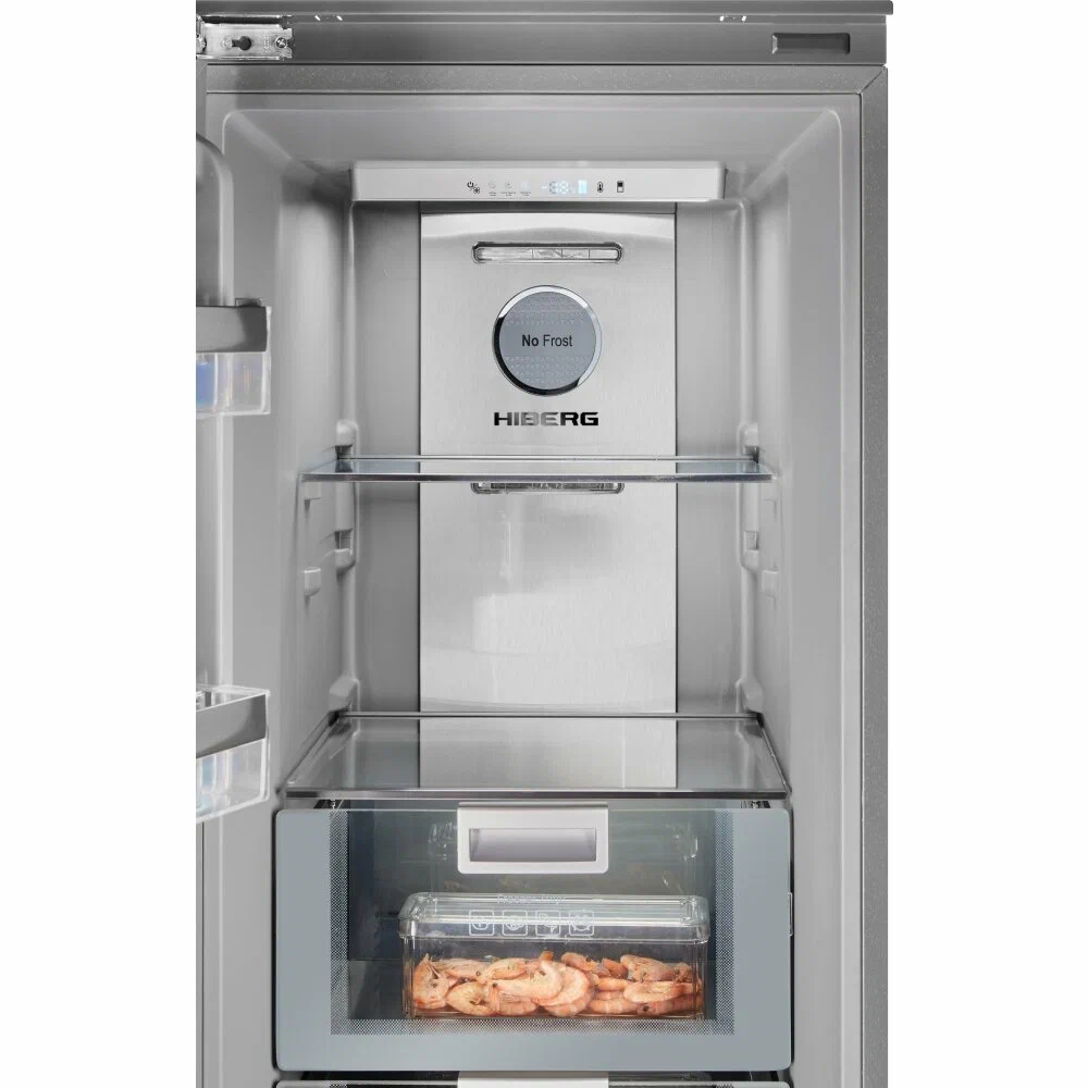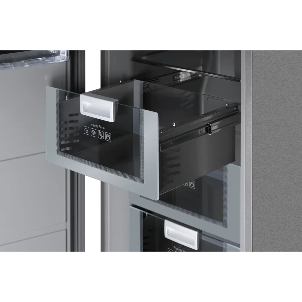 Морозильник создан для тех, кто привык уделять внимание дизайну и стилю. Внутренняя отделка модели выполнена в серых тонах. Стеклянные полки, ящики из нержавеющей стали и стекла и другие составляющие подарят эстетическое удовольствие и удобство хранения продуктов.
