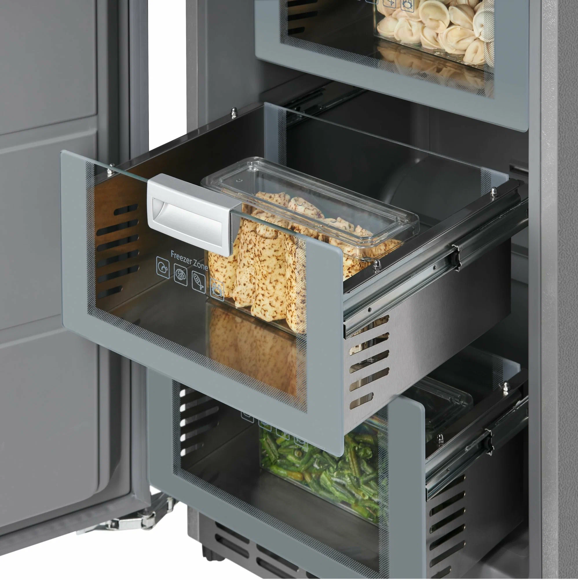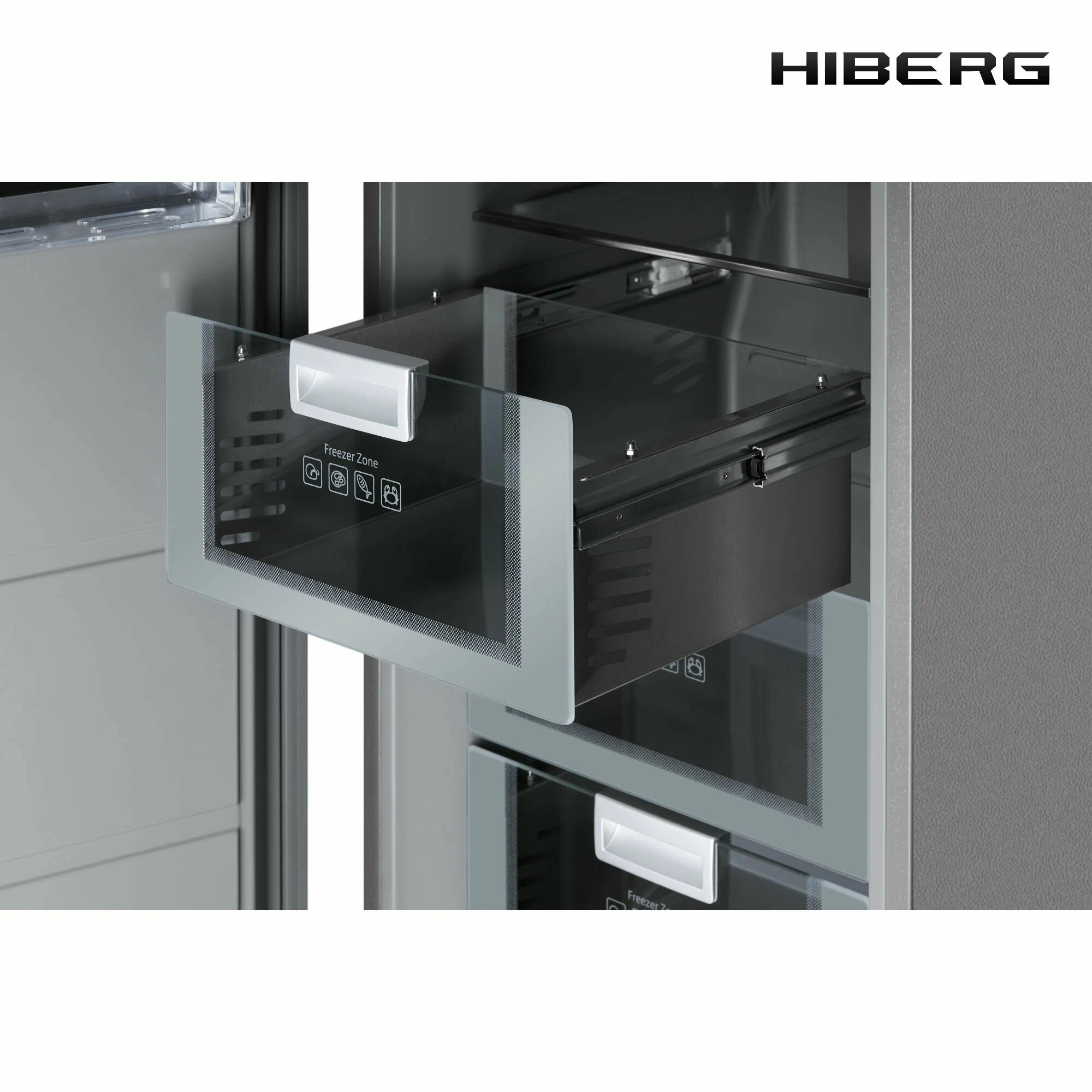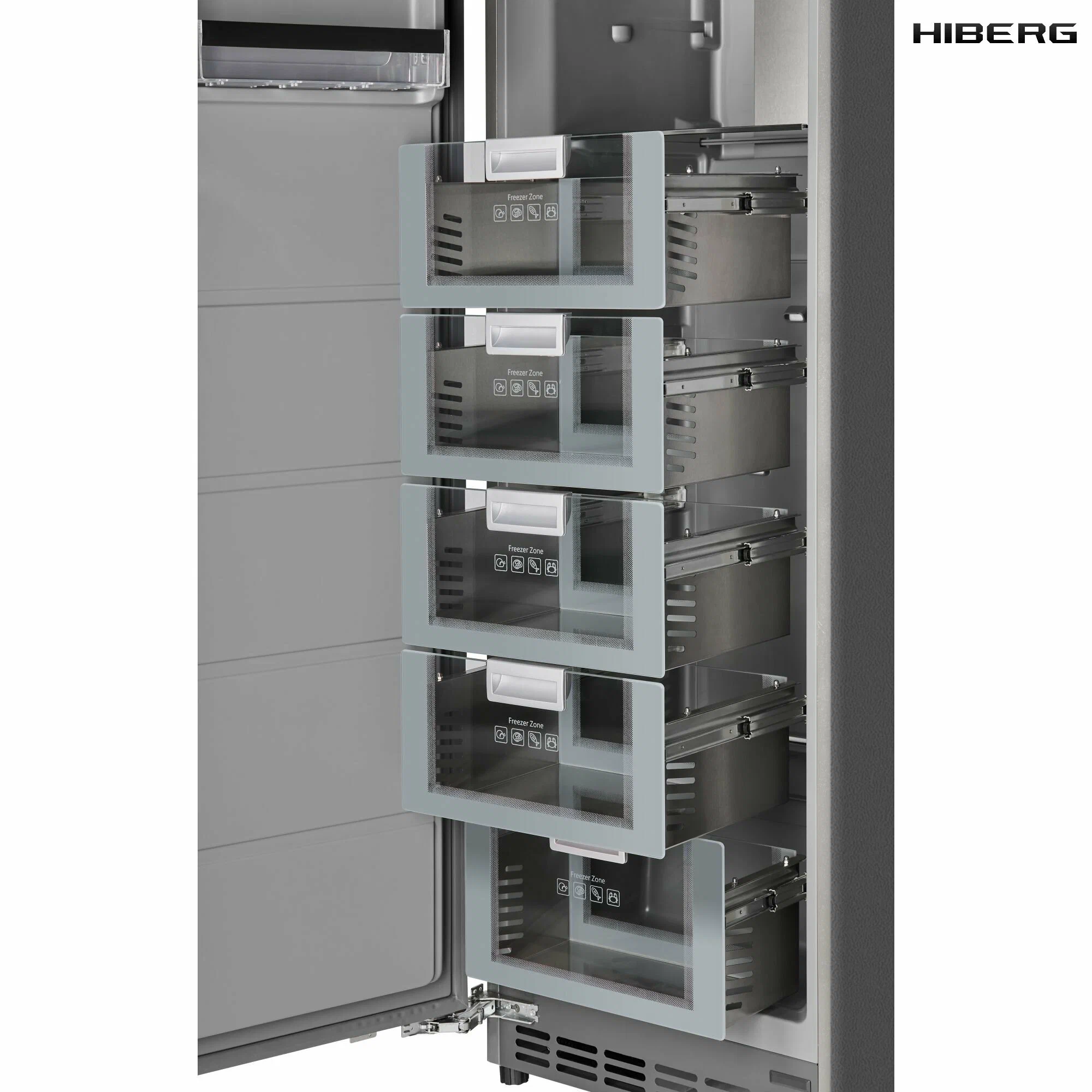 — 5 выдвижных ящиков из нержавеющей стали и стекла. Для плавного и мягкого открывания ящики выдвигаются на металлических направляющих. Нижний ящик увеличенного объема подходит для заморозки больших кусков мяса, птицы, морской рыбы. Полезный объем выдвижных ящиков — 125 литров;