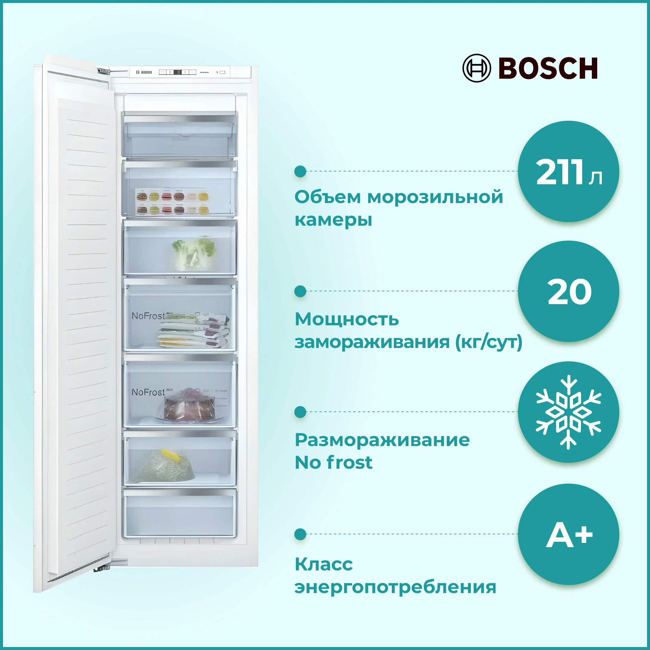 Встраиваемая морозильная камера Bosch GIN 81 AEF0U оснащена звуковой сигнализацией при повышении температуры, пять контейнеров, из которых два увеличенного объема BigBox, позволяют хранить разнообразные продукты. Технология freshSense позволяет отслеживать изменение окружающих условий за счет измерения температуры не только внутри, но и снаружи холодильника.Ключевые преимущества:Электронная регулировка температуры. Автоматический режим суперзамораживания. NoFrost