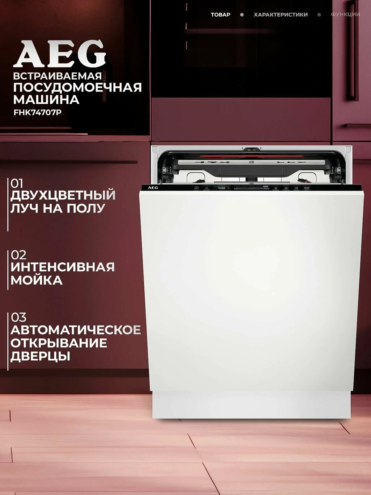 Посудомоечная машина AEG FHK74707P – инновационные технологии для идеальной чистотыОцените премиальный уход за посудой с AEG FHK74707P – полноразмерной встраиваемой посудомоечной машиной, созданной для максимального удобства и эффективности.15 комплектов посуды – идеально для больших семей и вечеринок.Технология AirDry – автоматическое открывание дверцы для естественного высушивания без разводов.7 программ мойки, включая AutoSense, GlassCare и ExtraSilent для бесшумной работы (всего 42 дБ).Полная защита от протечек AquaControl – безопасность на высшем уровне.Инверторный двигатель – надежность, тишина и низкое энергопотребление A+++.Сенсорное управление и LED-дисплей – удобное программирование с отсрочкой до 24 часов.Тройная корзина с ComfortRails – гибкое размещение посуды с регулируемой высотой и держателями для бокалов.Идеальное сочетание дизайна, функциональности и бережного ухода за посудой!