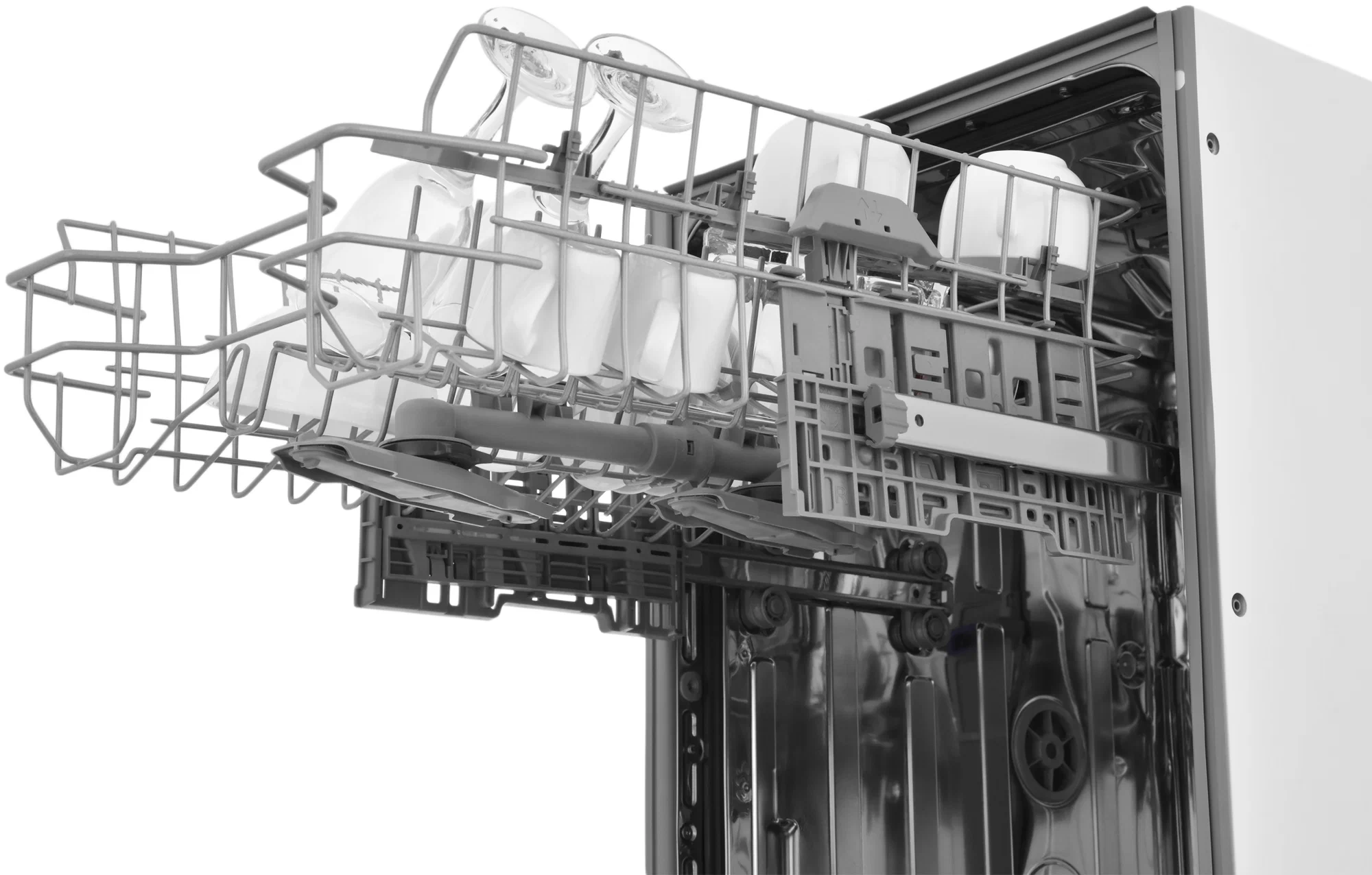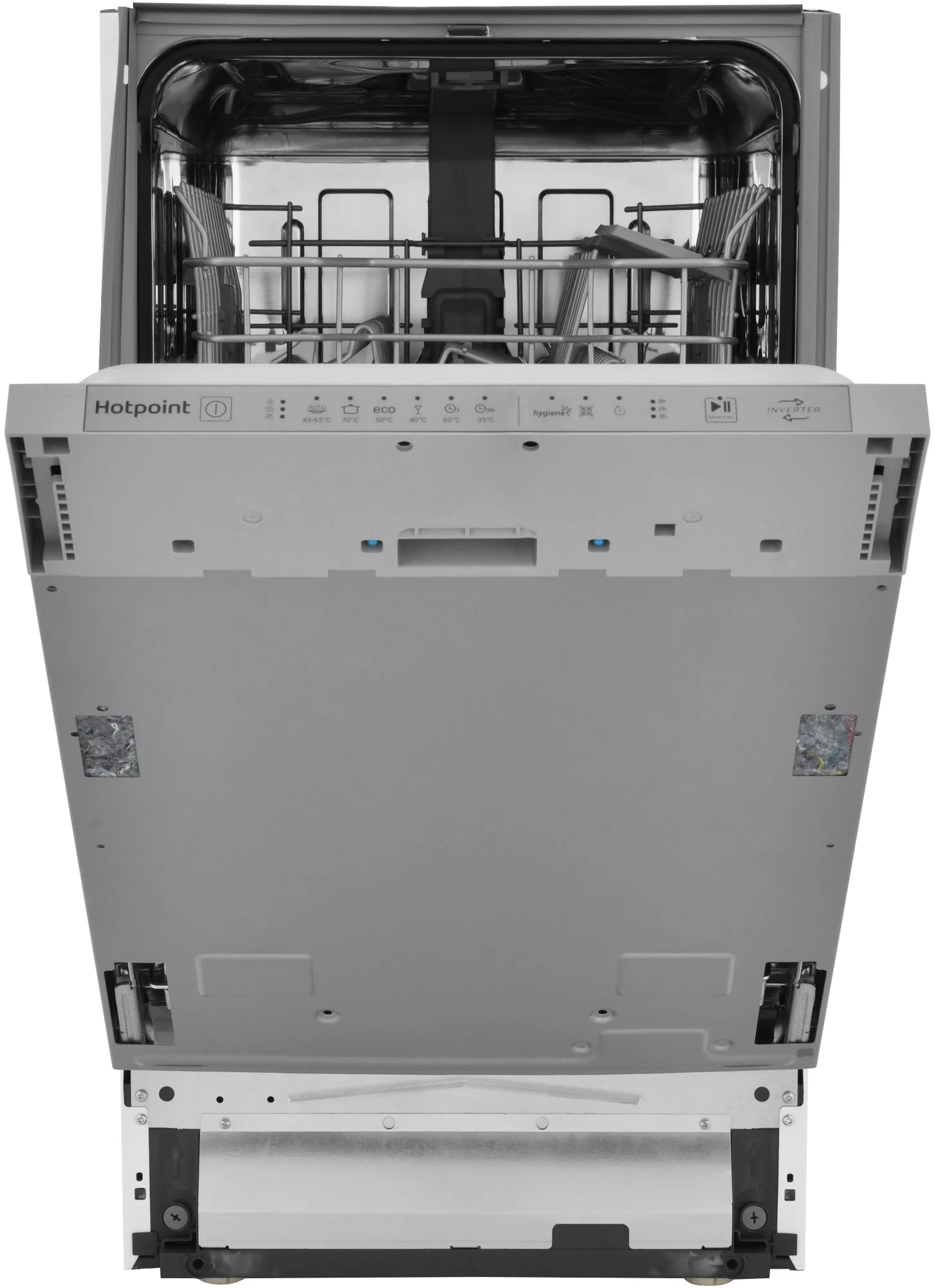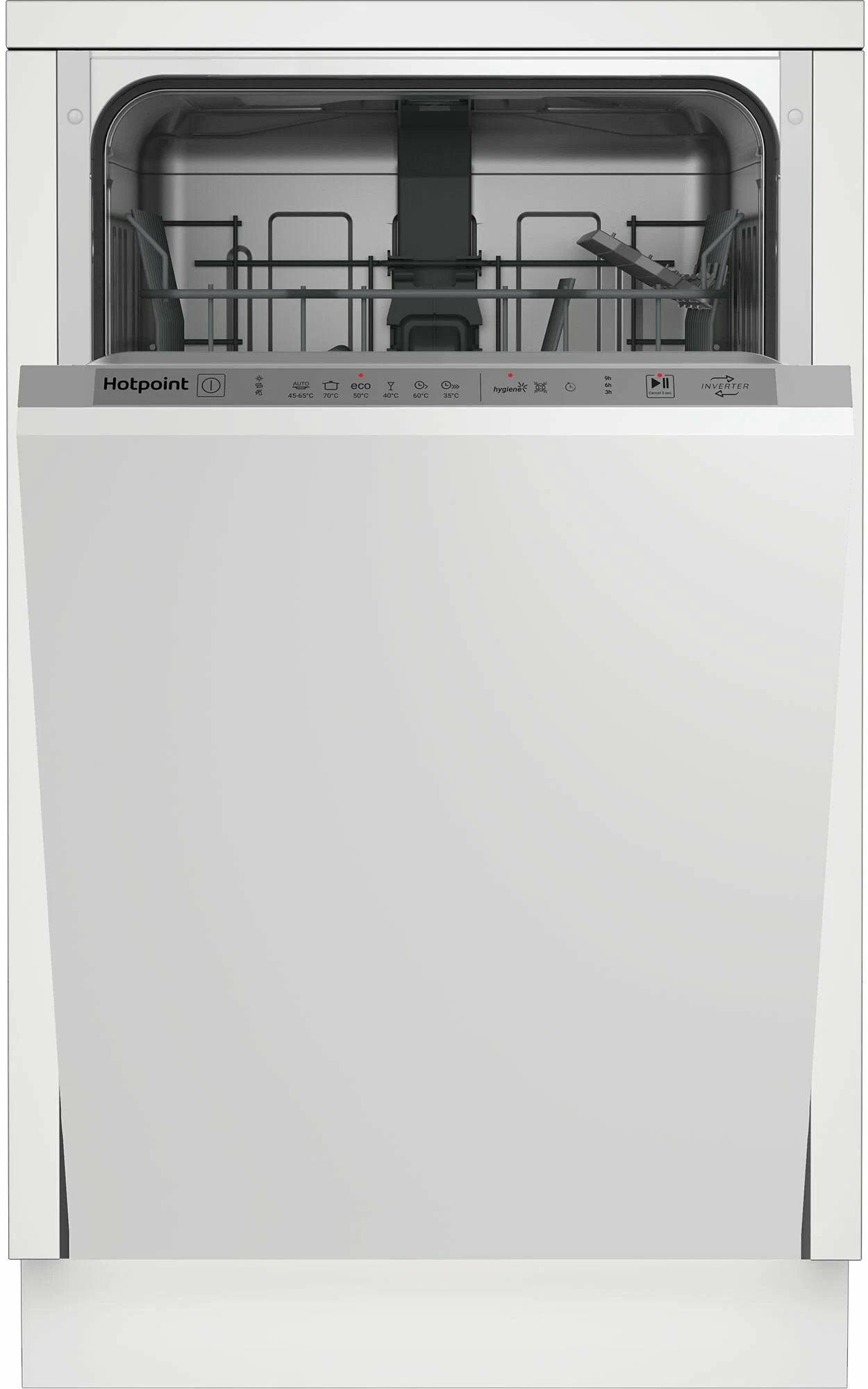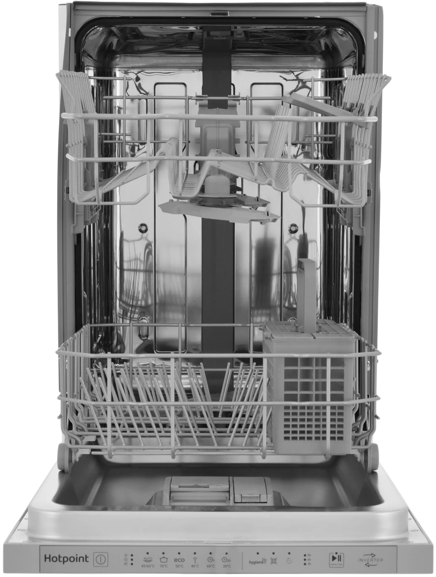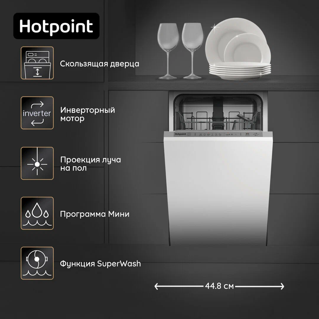 Встраиваемая посудомоечная машина, 45 см, вместимость 10 комплектов посуды, уровень шума 47дБ, средненее потребление воды за цикл 8,7л, 6 программ, сенсорное управление, инверторный мотор, частичная система защиты от протечек (Overflow Safety), луч на полу, скользящая дверь, функция гигиены. Скользящая корзина для столовых приборов, Сенсор загрязнения, Ионообменник (смягчение воды), индикация отсутствия соли, индикация отсутствия ополаскивателя, индикатор протечки, Функция: Гигиена (Hygiene+), Функция: SuperWash.