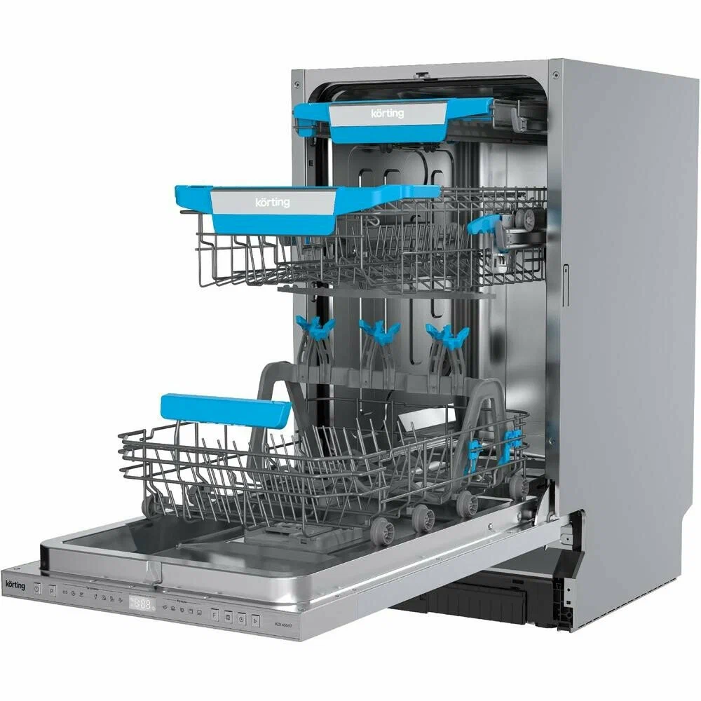 Посудомоечная машина KDI 45557 — это современный встраиваемый бытовой прибор шириной всего 45 см, что позволяет легко вписать её в небольшие кухонные пространства. Модель вмещает до десяти комплектов посуды и предлагает выбор из семи программ, что позволяет подобрать оптимальный режим для различных типов посуды и видов загрязнений. Специальная функция «Экспресс-мойка» может быть применена практически ко всем программам: одним нажатием кнопки ускоряется процесс мытья, при это не страдает качество. Программа «Гигиена» обеспечивает дополнительную защиту от бактерий и микробов, что делает её идеальной для мытья детской посуды и кухонных аксессуаров. Она гарантирует чистоту и безопасность без необходимости использования дополнительных химических средств. Режим «Экстра-сушка» немного увеличивает продолжительность выбранной программы, но значительно улучшает качество сушки посуды. Машина оснащена тремя корзинами и держателем для бокалов, регулятор высоты позволяет легко изменять расположение верхней корзины. Обновленный дизайн панели управления с цифровым дисплеем делает использование прибора еще более наглядным и удобным. Модель поддерживает комбинированные моющие средства в одной таблетке «All in 1» и оснащена слайдерным диспенсером для моющих средств. Для повышения удобства в повседневном использовании предусмотрена функция отложенного старта от 1 до 24 часов. Благодаря особой форме разбрызгивателей «S-Form» потоки воды равномерно распределяются по всей камере, эффективно удаляя загрязнения с посуды на всех уровнях. Функция «Луч на полу» проецирует световой индикатор на пол во время выполнения программы и отключает его по завершении процесса мойки. Внутреннее LED-освещение камеры добавляет комфорта и позволяет контролировать чистоту внутри прибора. Посудомоечная машина KDI 45557 обеспечивает полную защиту от протечек «AquaControl» и «AquaStop», имеет класс энергопотребления A++ и отличается низким уровнем шума, не превышающим 47 дБ.
