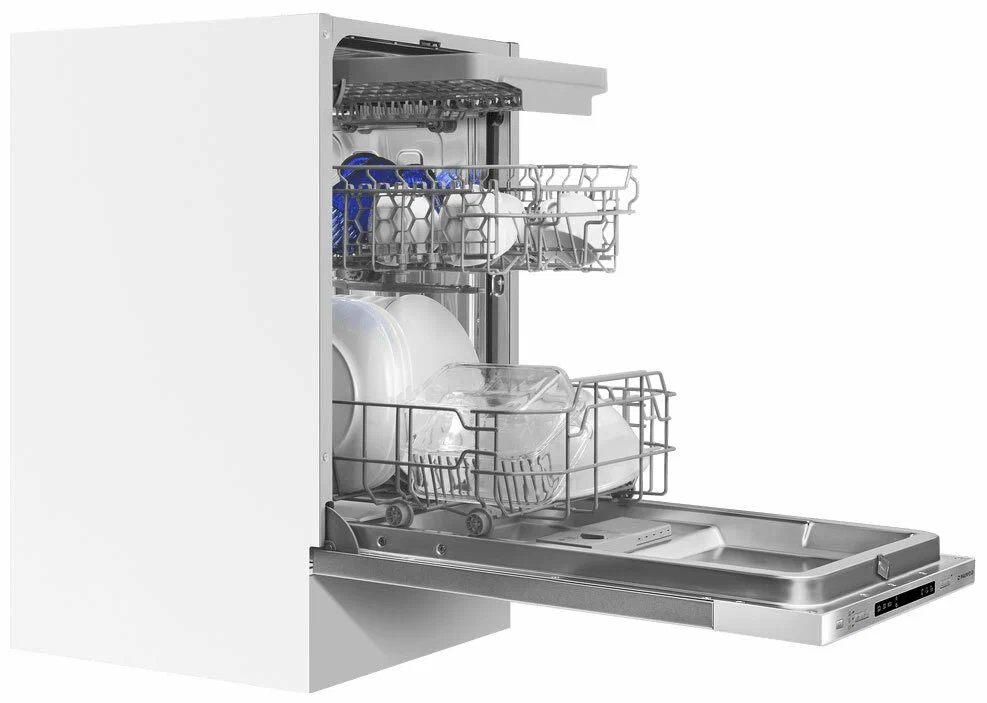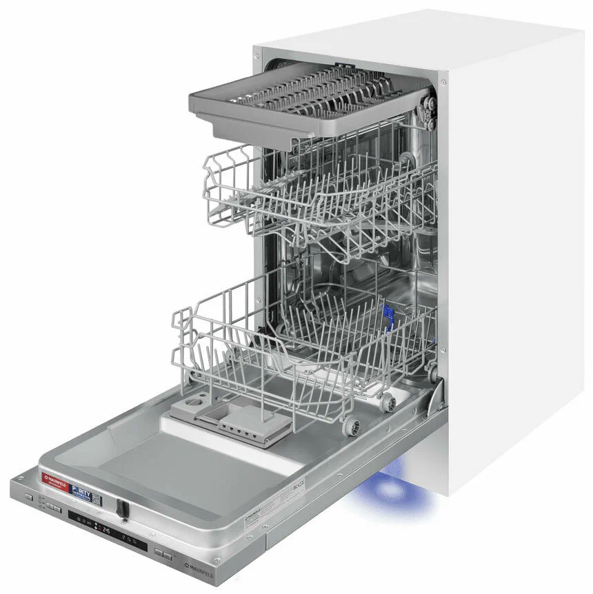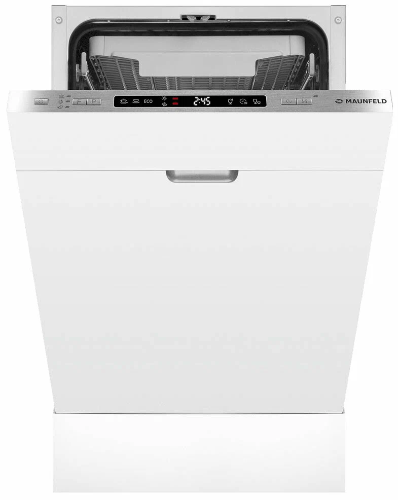 MAUNFELD MLP45130 Light Beam — это узкая модель, шириной 45 см (вместо классических 60 см), но весьма вместительная. За раз она может вымыть сразу много посуды, до 9 комплектов — это оценят в больших семьях, а также те, кто любит готовить, часто принимает гостей.MLP45130 Light Beam избавит вас от необходимости мыть посуду вручную. В машине максимально эффективно организовано внутреннее пространство. Есть удобная корзина для столовых приборов и мелкой утвари. Верхняя корзина — с изменяемой высотой установки, чтобы можно было мыть посуду разного размера и объёмов. В верхней корзине есть складные держатели для бокалов — дополнительное важное удобство.Предусмотрены несколько программ мытья для посуды разной степени загрязнения. В режиме «Интенсивная мойка» обеспечена обработка посуды очень горячей водой — для максимально качественного результата. Отложенный старт поможет запустить мытьё в удобное время, например, ночью, когда дешевле электроэнергия.Посудомоечная машина MAUNFELD MLP45130 Light Beam — помоет посуду без вашего участия, освобождая время для более приятных занятий.Система «Луч на полу» особенно актуальна для встраиваемых моделей, так как во время работы информационный дисплей машины скрыт под столешницей. При использовании этой системы на пол проецируется световой луч синего цвета, показывающий, что устройство работает. Луч гаснет, когда цикл завершен.Меньше шума, меньше беспокойстваБлагодаря специальному материалу камеры из нержавеющей стали создается гораздо меньше шума. Она абсорбирует вибрацию, за счет чего работает тихо, всего на уровне 49 дБ, что тише обычного разговора.Экономьте время с быстрой мойкойПрограмма быстрой мойки позволяет добиться идеальной чистоты всего за 30 мин, экономя ваше время. Эта программа подойдет для посуды, у которой нет сильных загрязнений, и всего через 30 мин. посуда будет чистой и сухой.Загрузка 9 комплектов посудыВ посудомоечную машину помещается много посуды. Можно накопить её в течение дня или помыть сразу всё после семейного торжества или вечеринки с друзьями. Вместимость — до 9 комплектов посуды.Функция Aqua StopЗащититесь от протечек воды с функцией Aqua Stop. При обнаружении неполадки подача воды и электричества прекращается, останавливая работу посудомоечной машины и тем самым исключая возникновение короткого замыкания и протечки.Экстра сушкаКонденсационная сушка, при использовании которой вы получите совершенно чистую и сухую посуду без мокрых пятен.Основные сведения:Габариты: 81.5x44.8x55 смКол-во комплектов посуды: 9Управление: электронноеКласс мойки: AКласс сушки: AКласс энергопотребления: A++Уровень шума, дБ: 49Программы:СтеклоИнтенсивная программаСтандартная программаЭкономичная программаПрограмма «90 минут»Быстрая программаДополнительные функции:Режим 1/2 загрузкиИспользование средств 3 в 1Управление и индикация:Луч на полуЗвуковой сигналДисплейОтсрочка старта: от 1 до 24 часов.Безопасность:Защита от протечек: АквастопДополнительная информация:Третий уровень загрузкиРасход воды за цикл, л: 9Тип сушки: конденсационнаяМаксимальная мощность, Вт: 2100Энергопотребление, кВтч/год: 211Материал корпуса: металлДлина шнура, см: 147Вес, кг: 30.12Декоративная панель (при наличии на фото) в комплектацию встраиваемой посудомоечной машины не входит! Данное фото носит информативный характер.