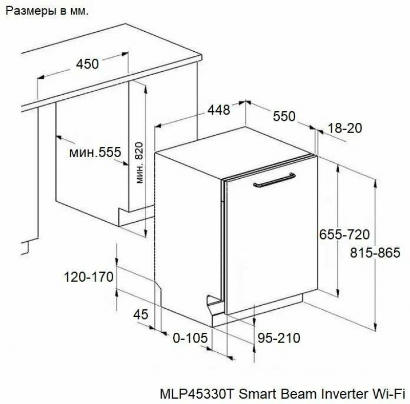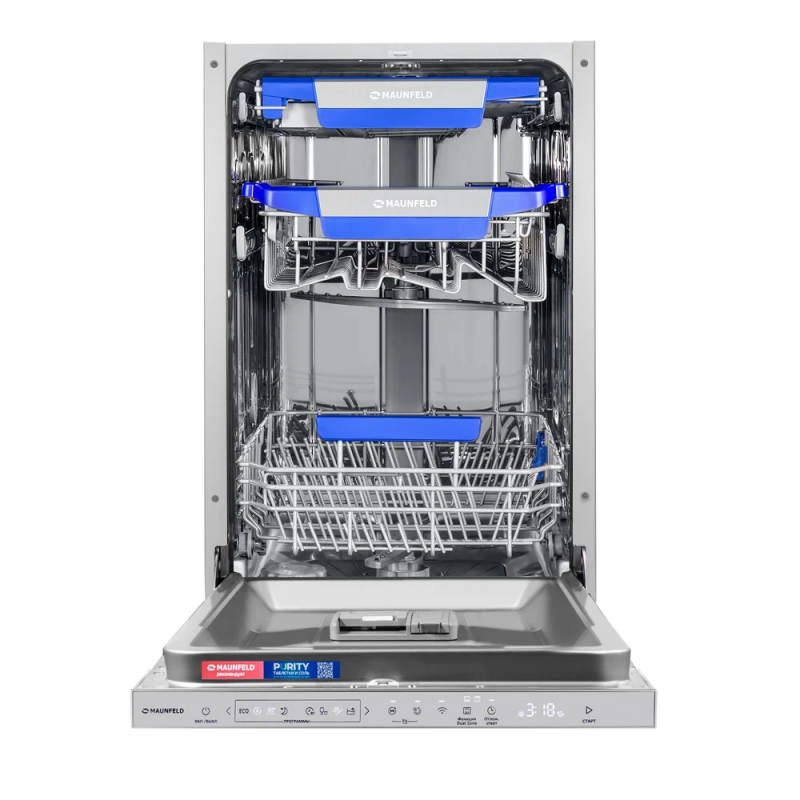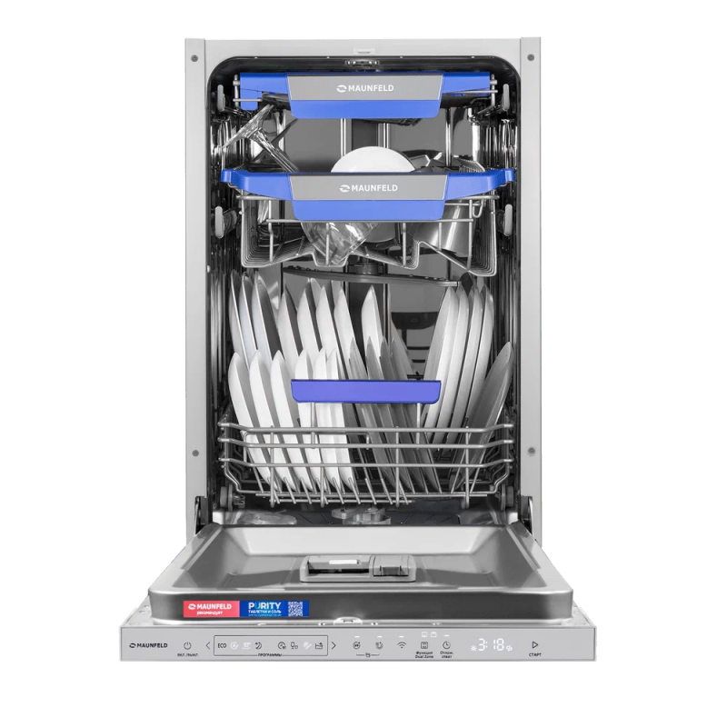 MAUNFELD MLP45330T Smart Beam Inverter Wi-Fi — это узкая модель, шириной 45 см (вместо классических 60 см), но весьма вместительная. За раз она может вымыть сразу много посуды, до 10 комплектов — это оценят в больших семьях, а также те, кто любит готовить, часто принимает гостей.Внутреннее LED освещение облегчает удобство загрузки и выгрузки посуды.MLP45330T Smart Beam Inverter Wi-Fi избавит вас от необходимости мыть посуду вручную. В машине максимально эффективно организовано внутреннее пространство. Есть удобная корзина для столовых приборов и мелкой утвари. Верхняя корзина — с изменяемой высотой установки, чтобы можно было мыть посуду разного размера и объёмов. В верхней корзине есть складные держатели для бокалов — дополнительное важное удобство.Предусмотрены несколько программ мытья для посуды разной степени загрязнения.Посудомоечная машина MAUNFELD MMLP45330T Smart Beam Inverter Wi-Fi — помоет посуду без вашего участия, освобождая время для более приятных занятий.Программы:Экономичная программаАвтоматическая программаПрограмма «Гигиена+»Программа «Ночная»Программа «90 минут»Быстрая программаПредварительное замачиваниеСамоочисткаПроекция таймера на пол особенно актуальна для встраиваемых моделей, так как во время работы информационный дисплей машины скрыт под столешницей. При использовании этой системы на пол проецируется световой луч синего цвета, показывающий, что устройство работает. Луч гаснет, когда цикл завершен.Меньше шума, меньше беспокойстваБлагодаря специальному материалу камеры из нержавеющей стали создается гораздо меньше шума. Она абсорбирует вибрацию, за счет чего работает тихо, всего на уровне 47 дБ, что тише обычного разговора.Экономьте время с быстрой мойкойПрограмма быстрой мойки позволяет добиться идеальной чистоты всего за 30 мин, экономя ваше время. Эта программа подойдет для посуды, у которой нет сильных загрязнений, и всего через 30 мин. посуда будет чистой и сухой.Функция Aqua StopЗащититесь от протечек воды с функцией Aqua Stop. При обнаружении неполадки подача воды и электричества прекращается, останавливая работу посудомоечной машины и тем самым исключая возникновение короткого замыкания и протечкиЗагрузка 10 комплектов посудыВ посудомоечную машину помещается много посуды. Можно накопить её в течение дня или помыть сразу всё после семейного торжества или вечеринки с друзьями. Вместимость — до 10 комплектов посуды.Дополнительная сушкаУлучшает качество сушки посуды, за счёт увеличения температуры на последнем этапе полоскания увеличения времени сушки. При включении функции на дисплее будет подсвечен соответствующий индикатор.Посудомоечная машина MAUNFELD MLP45330T Smart Beam Inverter Wi-Fi оснащена дисплеем и удобной системой управления. Благодаря функции Wi Fi, возможен удаленный запуск машины через приложение на смартфоне. Также есть индикаторы наличия ополаскивателя, соли и времени до окончания программы. Машина имеет класс энергопотребления A+++, что говорит о ее высокой энергоэффективности. Уровень шума составляет всего 44 дБ, что делает ее одной из самых тихих моделей на рынке. Внутренний резервуар выполнен из нержавеющей стали, что обеспечивает его долговечность и устойчивость к коррозии.Особенностью данной модели является инверторный двигатель, который обеспечивает бесшумную и эффективную работу машины.Автоматическое открывание двери после з