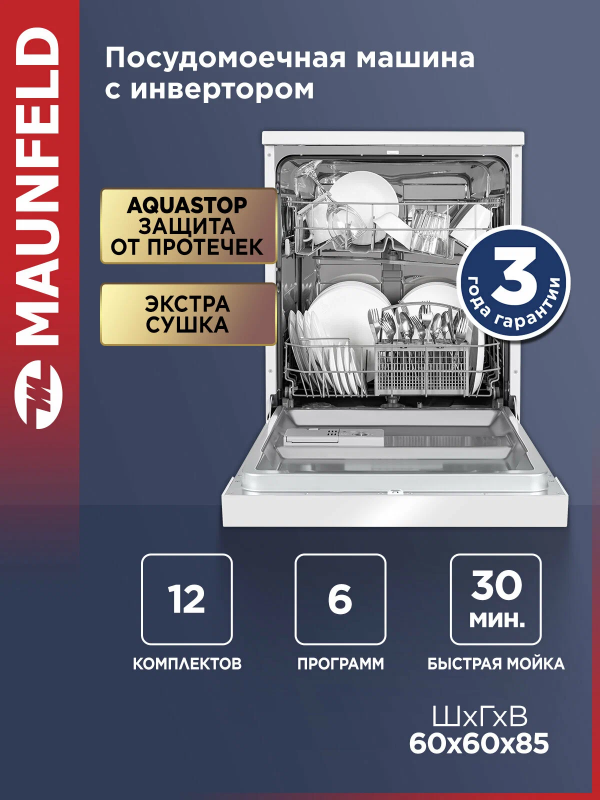 Большая вместительность до 12 комплектов поможет в кратчайшие сроки ликвидировать беспорядок даже после многочисленных гостей.Высокая энергоэффективность способствует экономии электроэнергии.Удобный дисплей и элементы управления посудомоечной машины минимизируют ручной труд. Достаточно лишь загрузить посуду, выбрать нужный режим и запустить. Можно отслеживать процесс с помощью индикатора остаточного времени. Также есть активная конденсационная сушка, при использовании которой вы получите совершенно чистую и сухую посуду без мокрых пятен.Благодаря отсрочке старта можно в течение дня докладывать предметы внутрь, либо же настроить запуск так, чтобы машина включилась в нужное время (особенно это актуально ночью, когда любой шум выступает, как раздражитель). Есть различные режимы на все случаи жизни. Для хрупкой посуды типа тонких бокалов или фарфора имеется своя программа «стекло» для деликатной мойки.Нужная информация всегда на видуНа большом и широком светодиодном дисплее можно с комфортом просматривать всю информацию о посудомоечной машине. Настройки, оставшееся время, текущее состояние, режим, — всё это можно увидеть даже на расстоянии нескольких метров.Экономия с функцией половинной загрузкиЭкономьте энергию и время с функцией половинной загрузки. Она позволяет разместить посуду исключительно в нижней зоне, что существенно ускоряет процесс мойки.Эффективное уничтожение бактерийИспользуя программу «Интенсивная», можно гарантировать уничтожение бактерий. При её активации температура воды повышается до 65 градусов, а время полоскания значительно продлевается.Чистая посуда всего за 30 минутИспользуйте режим экспресс-мойки (быстрая), когда чистая посуда нужна в кратчайшие сроки. На полный цикл очистки и сушки уйдёт всего 30 минут, а сам режим отлично подходит для небольших загрузок.Функция «Блокировка от детей» предназначена для защиты элементов управления от случайных нажатий.Половинная загрузкаМало грязной посуды? Загрузите одну корзину и сэкономьте на воде и электроэнергии.Класс энергопотребления A++Машина потребляет значительно меньше электроэнергии, при этом эффективность стирки остается на высоком уровне.Программы:Интенсивная программаСтандартная программаЭкономичная программаСтеклоПрограмма «90 минут»Быстрая программа