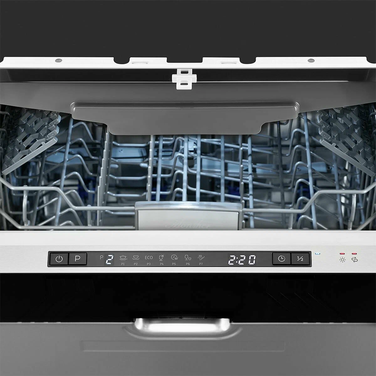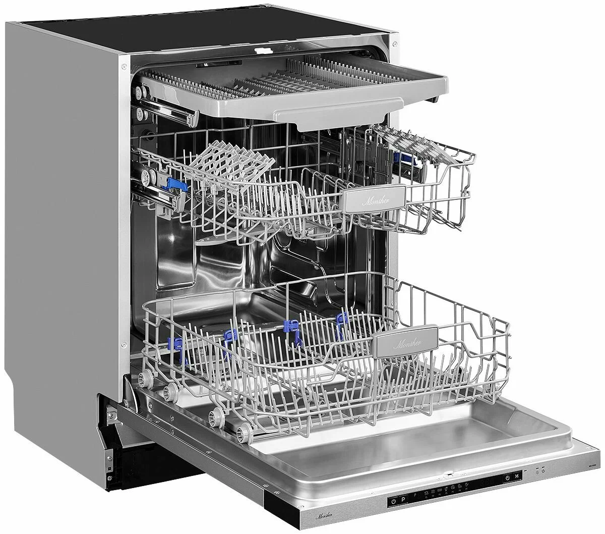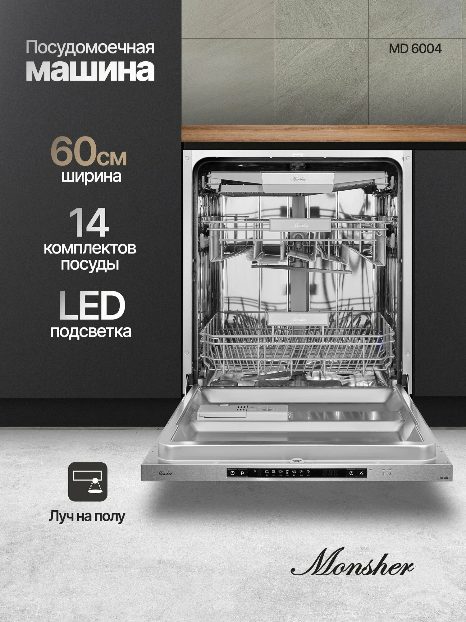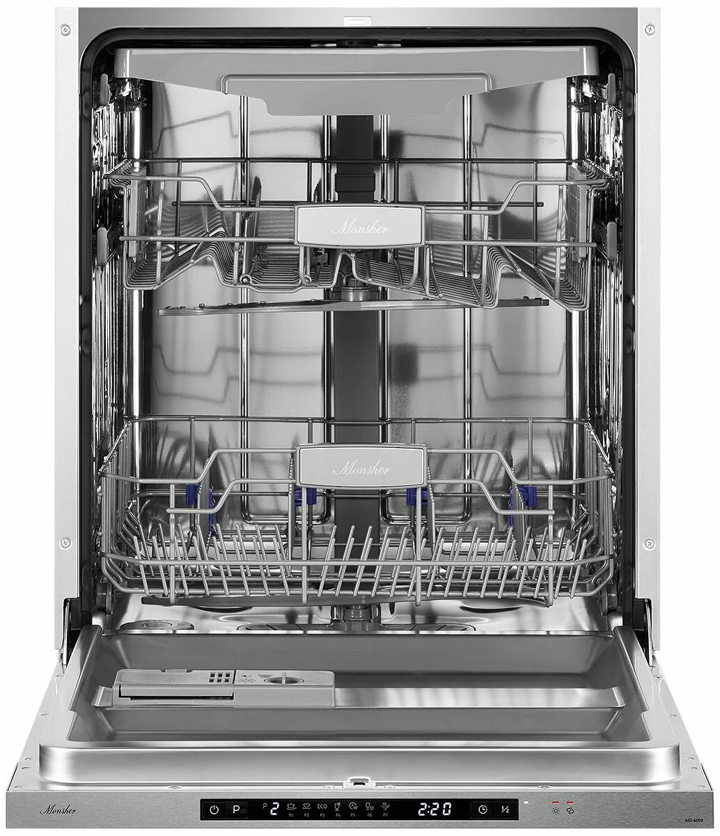 Посудомоечная машина Monsher MD 6004 — это надёжное и эффективное устройство, которое поможет вам сэкономить время и ресурсы. Она защищена от протечек и может одновременно очищать до 14 комплектов посуды. Уровень шума всего 47 дБ, что делает её работу практически бесшумной.Устройство оснащено удобным цифровым дисплеем, с помощью которого можно выбрать одну из семи доступных программ. В машине есть отдельные полки для бокалов и чашек, а также предусмотрена возможность регулировки высоты верхней корзины.Основные характеристики:- Ширина: 59,8 см.- Глубина: 55 см.- Высота: 81,5 см.- Класс энергопотребления: A++.- Расход воды за цикл: 11 л.- Отложенный старт: до 24 часов.- Тип сушки: конденсационная.- Вместимость: 14 комплектов.- Класс мойки и сушки: A.