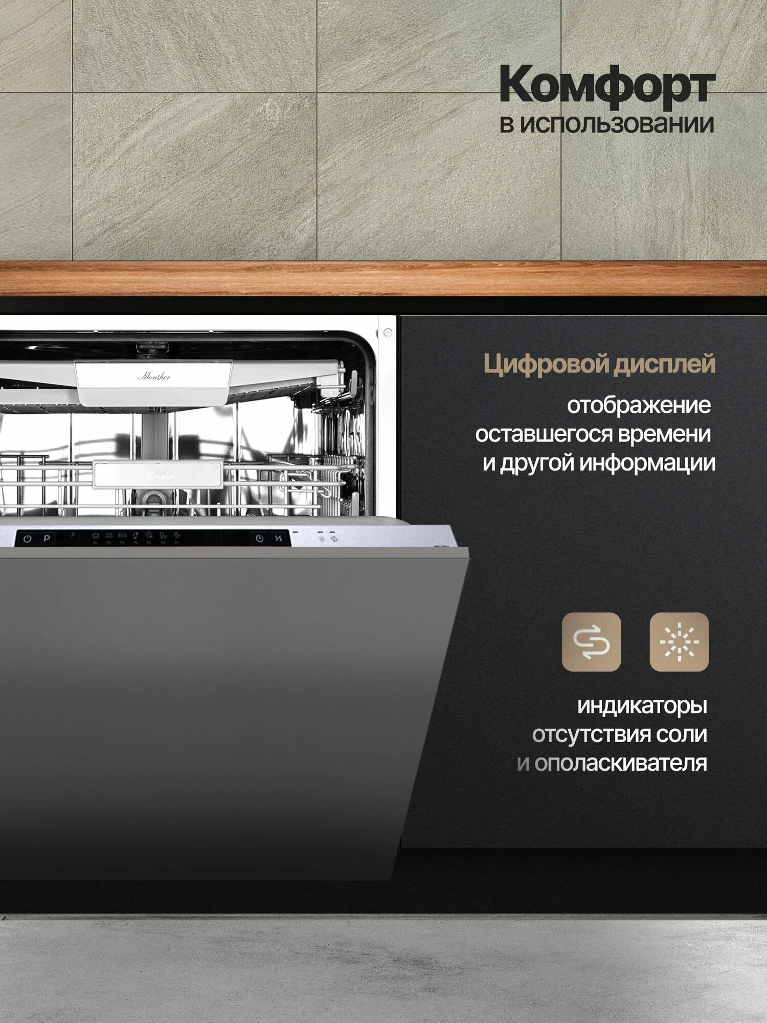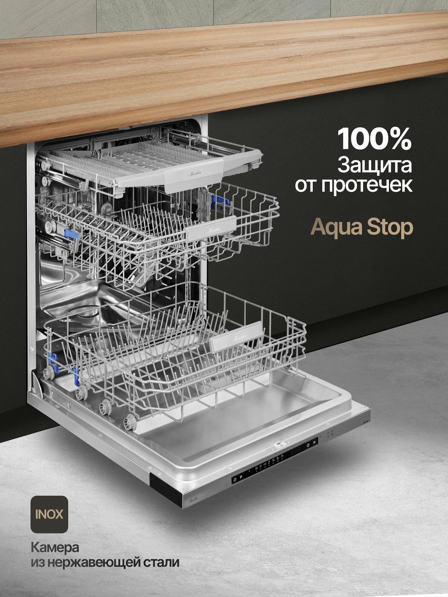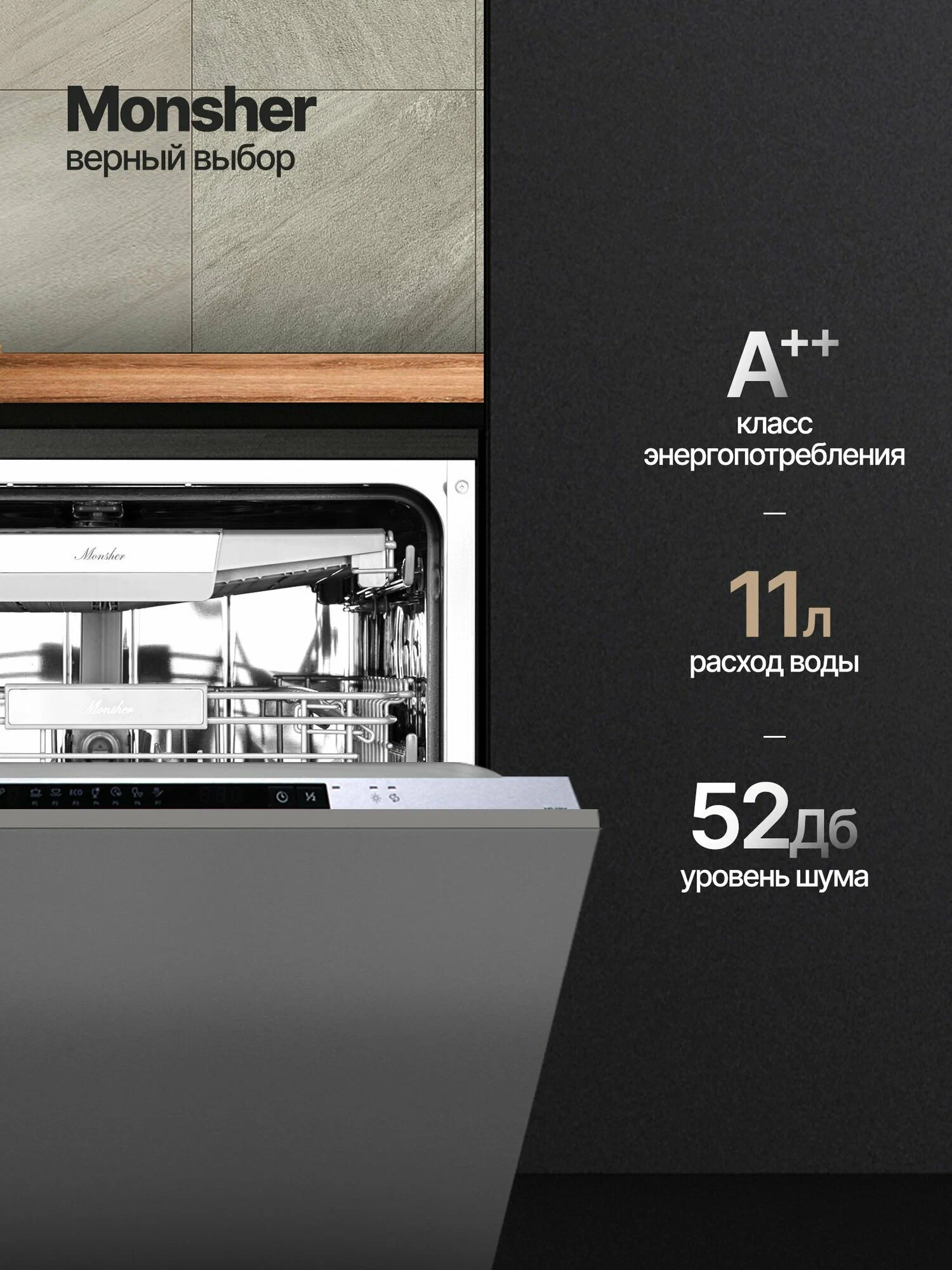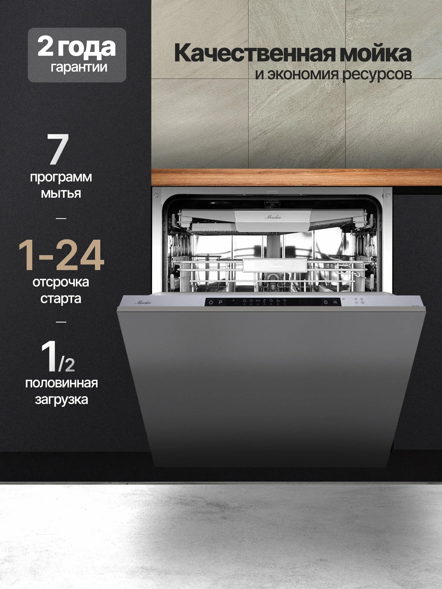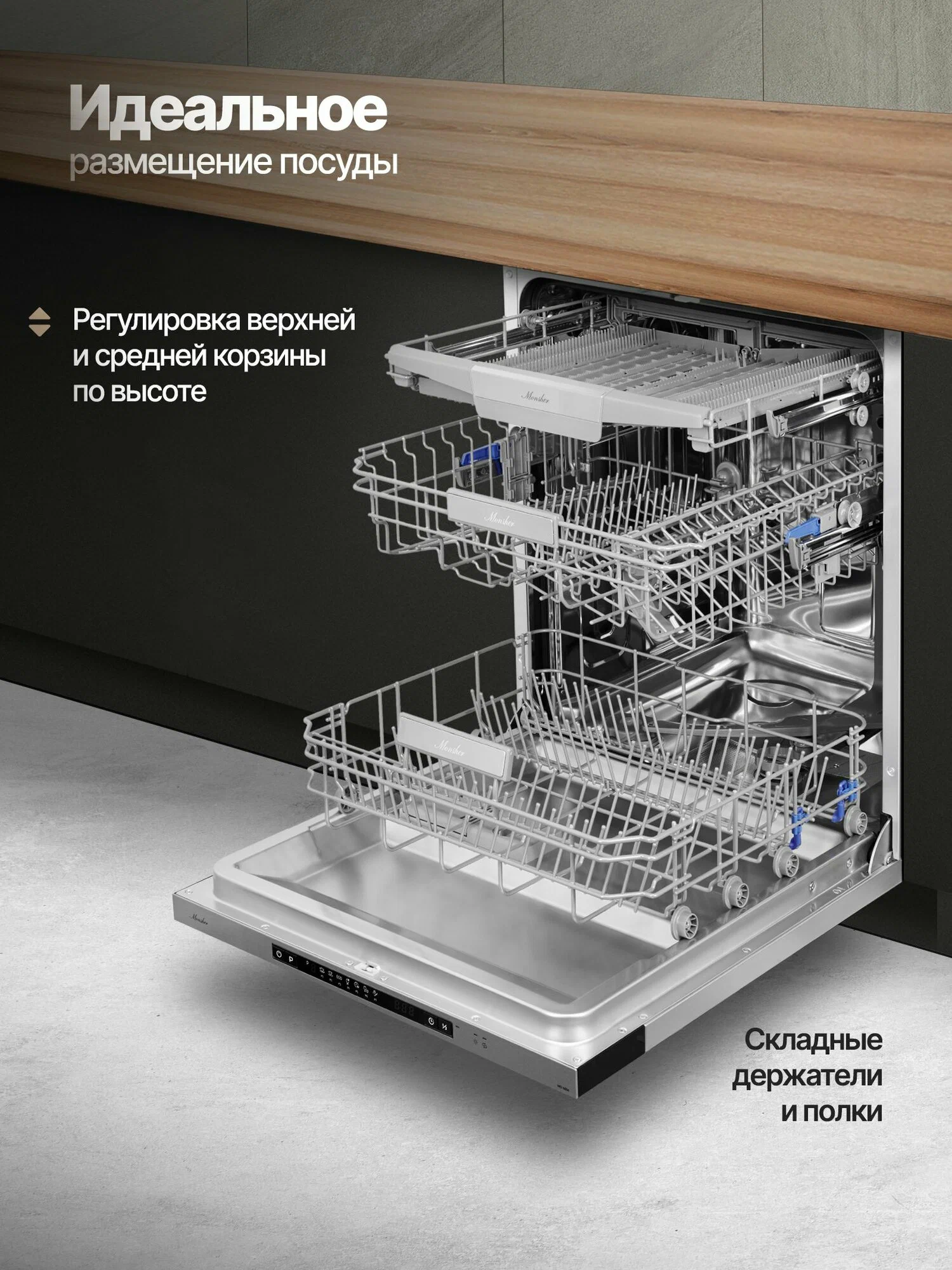 Посудомоечная машина Monsher MD 6004 — это надёжное и эффективное устройство, которое поможет вам сэкономить время и ресурсы. Она защищена от протечек и может одновременно очищать до 14 комплектов посуды. Уровень шума всего 47 дБ, что делает её работу практически бесшумной.Устройство оснащено удобным цифровым дисплеем, с помощью которого можно выбрать одну из семи доступных программ. В машине есть отдельные полки для бокалов и чашек, а также предусмотрена возможность регулировки высоты верхней корзины.Основные характеристики:- Ширина: 59,8 см.- Глубина: 55 см.- Высота: 81,5 см.- Класс энергопотребления: A++.- Расход воды за цикл: 11 л.- Отложенный старт: до 24 часов.- Тип сушки: конденсационная.- Вместимость: 14 комплектов.- Класс мойки и сушки: A.