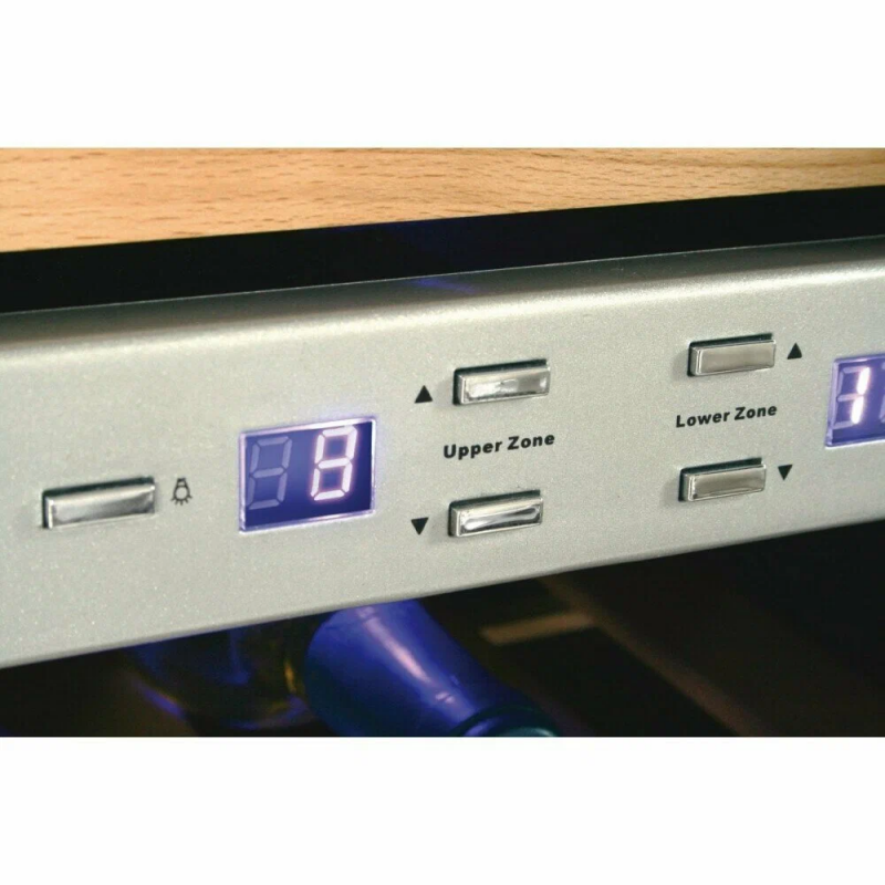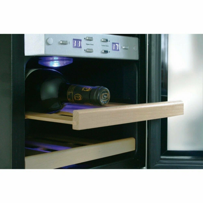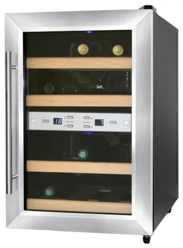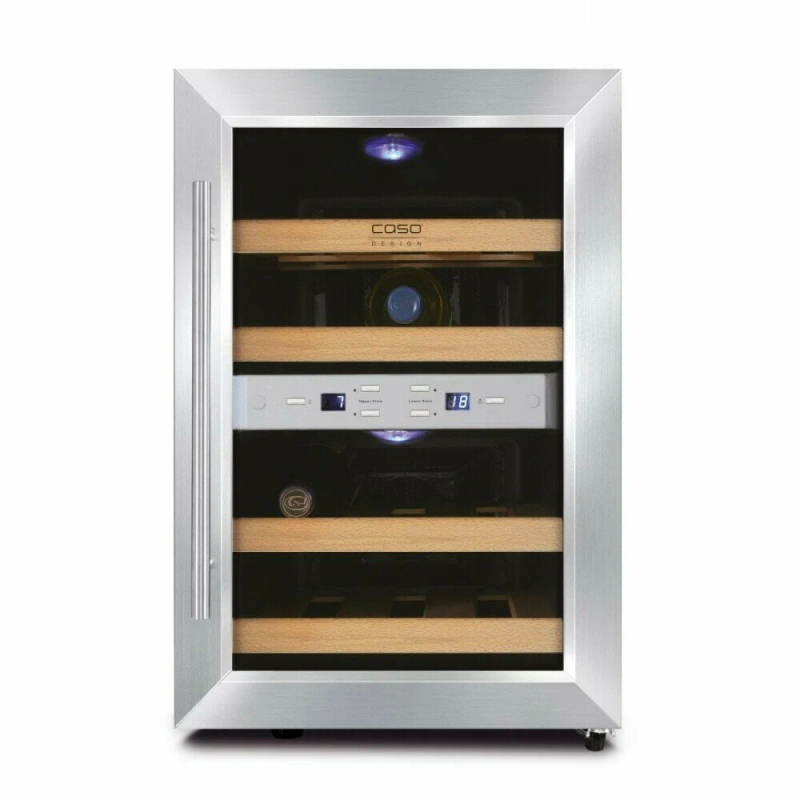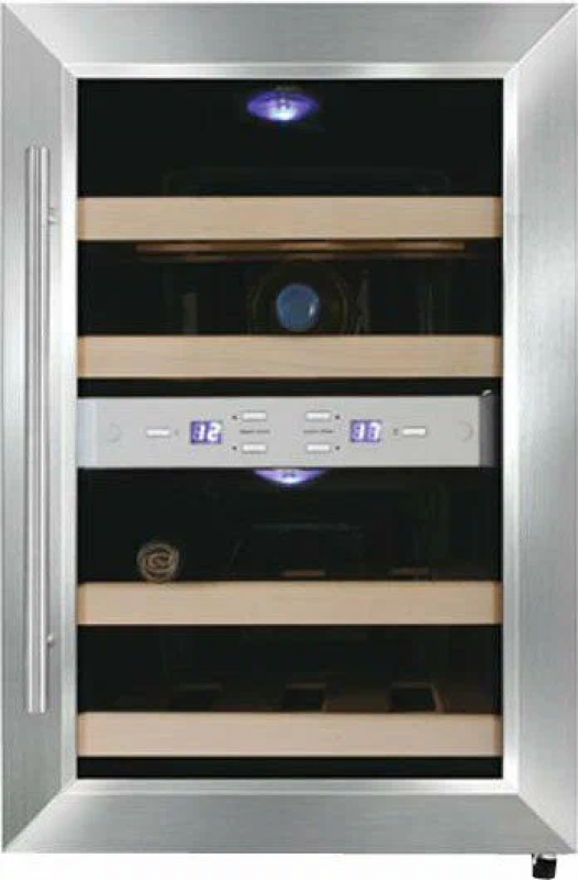 Двухзонный термоэлектрический винный холодильник CASO WineDuett 12, оснащенный уникальной системой охлаждения функционирующей по принципу Пельтье. Охлаждение происходит за счет полупроводниковых элементов, расположенных внутри холодильной камеры. У данной модели нет компрессора, поэтому содержимое винного шкафа не подвержено вибрациям, которые губительно влияют на качество вина (в отличие от компрессорных агрегатов). Четыре съемных полки из дерева предназначены для правильного хранения вина: бутылки кладутся горизонтально (вместительность – 12 бутылок). Управление осуществляется при помощи двух сенсорных панелей внутри холодильника. Кнопка «C/F» - переключатель режима температуры с градусов Цельсия, на Фаренгейт. Регулировка температурных показателей с шагом в 1°C происходит нажатием « ∧ » и «∨». Управление внутренним освещением возможно при помощи кнопки «Свет». Красивая подсветка силуэтов бутылок синим цветом, обеспечивается за счет светодиодных панелей. Встроенные светодиоды не нагреваются, и внутренний микроклимат остается максимально благоприятным для хранения бутылок.Винный шкаф CASO WineDuett 12 оснащен одной камерой, не шумит в работе, идеально подходит для гостиничных номеров или небольших квартир. Циркуляция воздуха внутри происходит равномерно за счет низкооборотного вентилятора. Верхняя зона с температурным диапазоном от 7 до 18°C рассчитана для белого вина, нижняя зона (от 10 до 18°C) - для красного вина. На стеклянной дверце устройства имеется специальный UV-фильтр, который защищает вино от прямого воздействия солнечных лучей. Стальной корпус стойкий к царапинам. Уход за оборудованием осуществляется с помощью неагрессивных моющих средств.