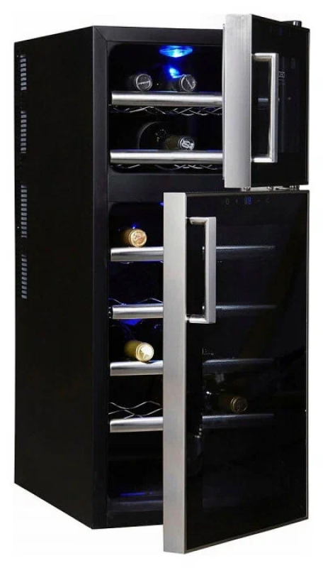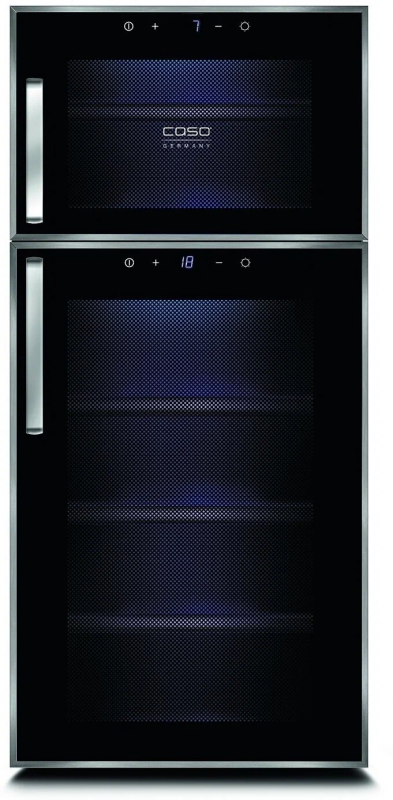 Винный шкаф Caso WineDuett Touch 21 представляет собой двухзонный термоэлектрический холодильник, оснащенный уникальной системой охлаждения по принципу Пельтье. Это обеспечивает равномерное охлаждение содержимого винного шкафа без вибраций, которые могут негативно влиять на качество вина.Особенностью данной модели является наличие четырех выдвижных металлических полок, предназначенных для правильного хранения вина. Бутылки кладутся горизонтально, вмещая в себя до 21 бутылки. Управление осуществляется при помощи двух сенсорных панелей с ЖК-дисплеем внутри холодильника. Регулировка температурных показателей с шагом в 1°C происходит нажатием «∧» и «∨».Винный шкаф оснащен двумя автономными камерами, каждая из которых функционирует как отдельный холодильник. Верхняя камера предназначена для хранения белого вина с температурным диапазоном от 7 до 18°C, а нижняя – для красного вина с диапазоном от 10 до 18°C.На стеклянной дверце устройства имеется специальный UV-фильтр, защищающий вино от прямого воздействия солнечных лучей. Стальной корпус устойчив к царапинам, а уход за оборудованием осуществляется с помощью неагрессивных моющих средств.Винный шкаф Caso WineDuett Touch 21 имеет класс энергопотребления B, климатический класс N (16-32°C), годовое энергопотребление составляет 168 кВт. Уровень шума составляет 45 дБ, а хладагент – R600a (изобутан).Винный шкаф Caso WineDuett Touch 21 – это двухзонный холодильник, который обеспечивает правильное хранение вина и удобство использования благодаря сенсорному управлению и ЖК-дисплею.