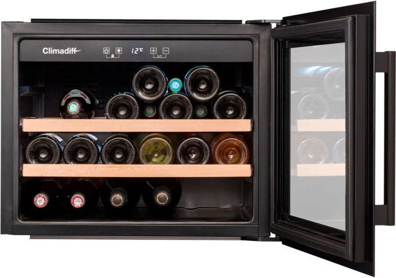 Ярким представителем французской товарной марки Climadiff (Климадифф) является компактный встраиваемый винный шкаф модели CBI28S1B. Его можно устанавливать внутри декоративной колонны. Гарантия качества от компании производителя составляет 36 месяцев. Внутри холодильника поддерживается единая температурная зона от 5 до 20 градусов по шкале Цельсия. Оптимальные условия для хранения напитков поддерживает мощная компрессорная система охлаждения и система индикации температуры. Дверцу холодильника можно перенавесить. Общая вместительность модели составляет 28 бутылок, которые размещаются на прочных полках из натуральной древесины высокого качества. Особенностью шкафа является стильная светодиодная подсветка.