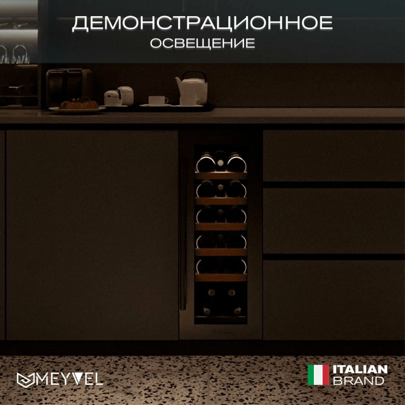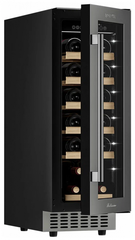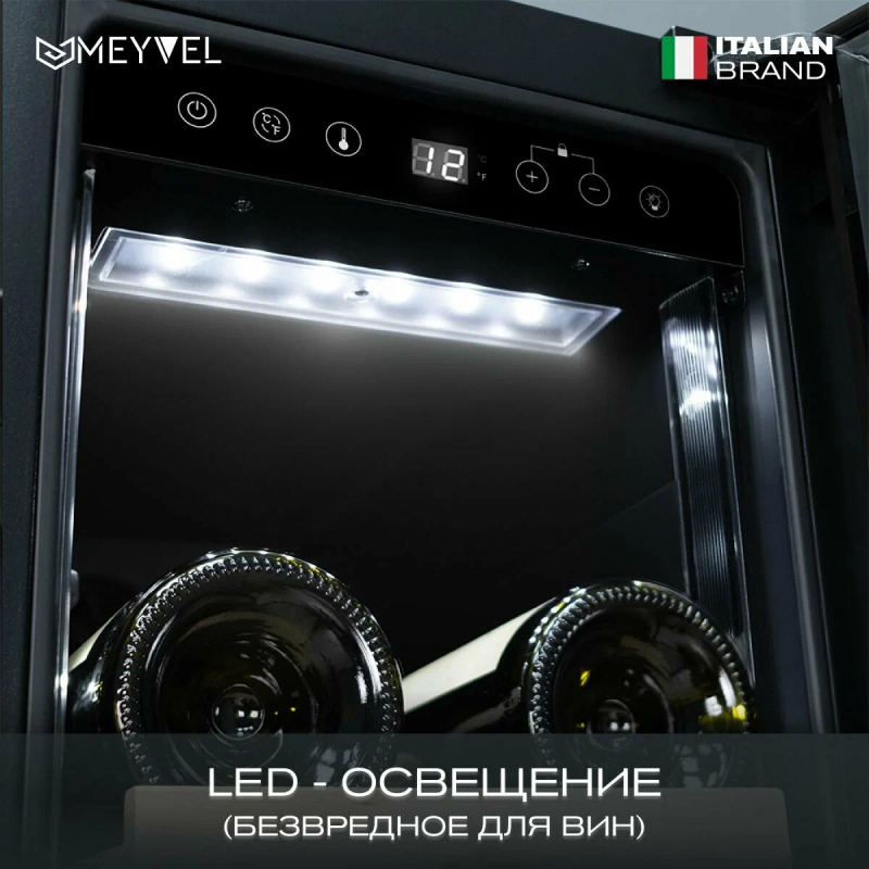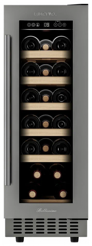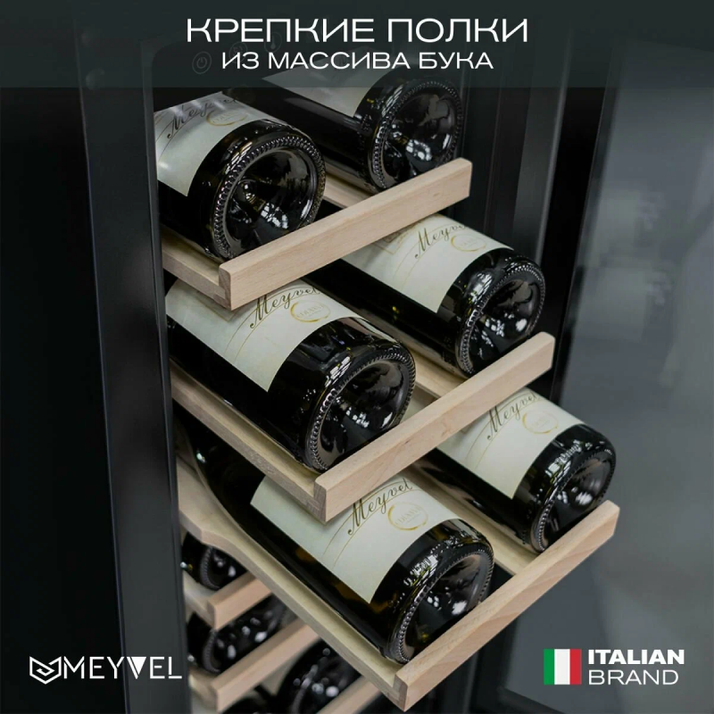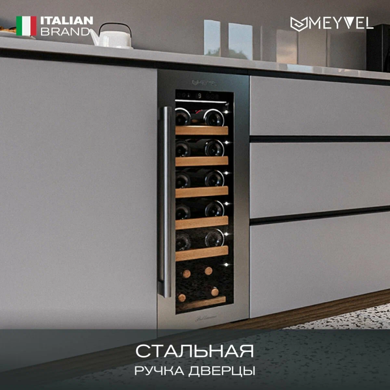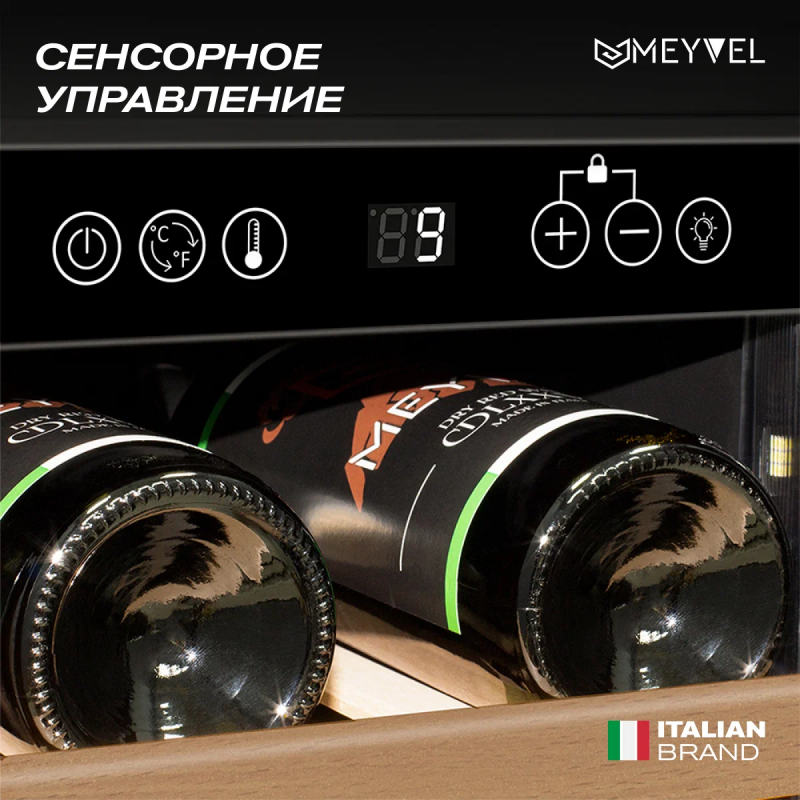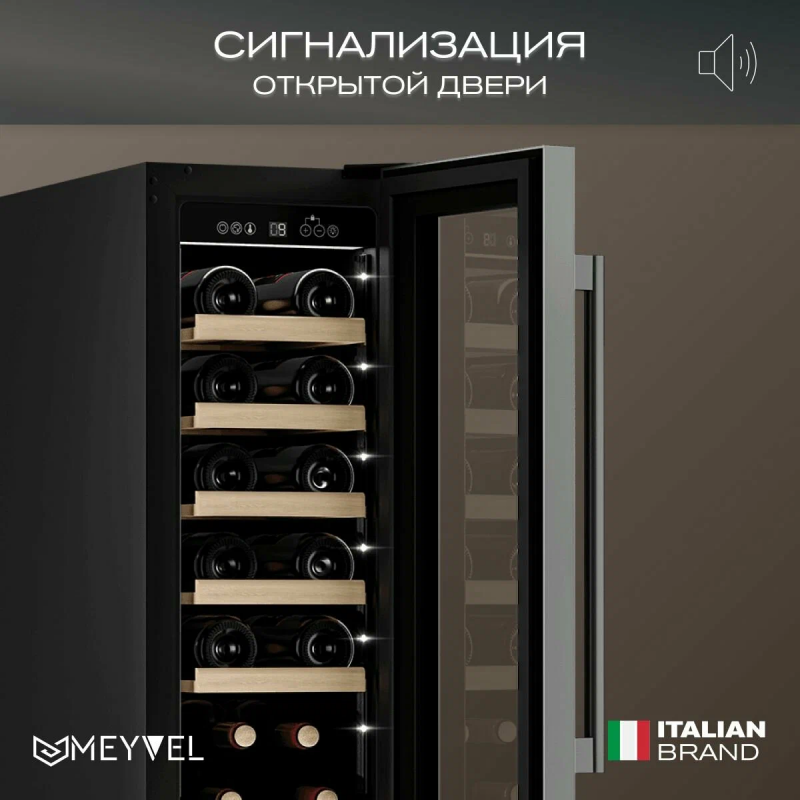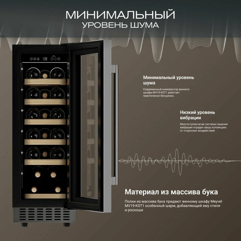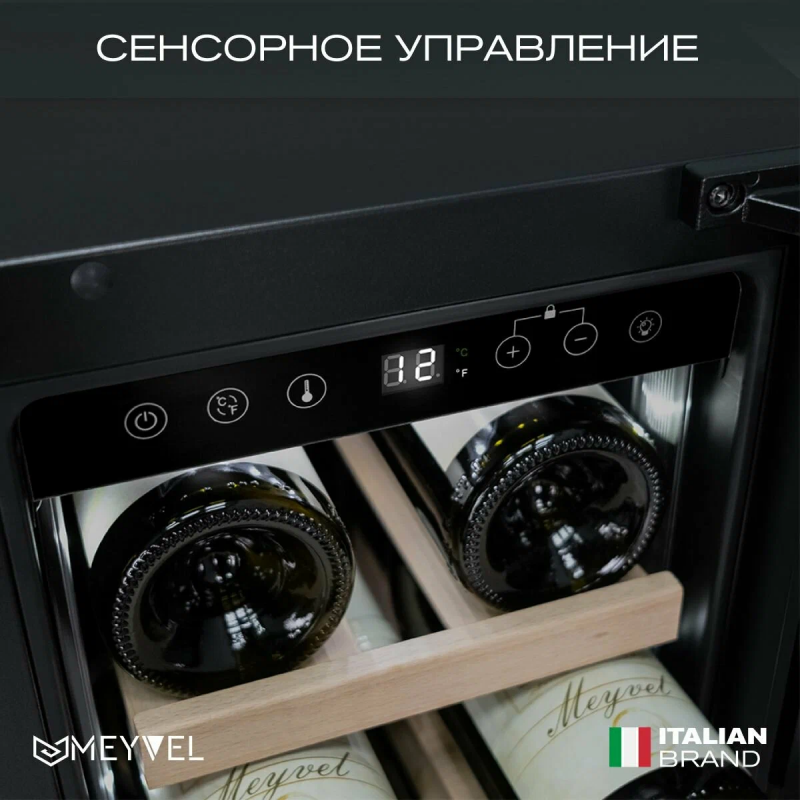Модель MV19-KST1 имеет привлекательный внешний вид, сочетающий в себе неподвластное времени очарование натуральных материалов с высокотехнологичными системами сохранения продуктов. Винный холодильник Meyvel MV19-KST1 оснащен дверью с защитой от ультрафиолетовых лучей и отлично подойдет для хранения и созревания различных сортов вин. Динамическая система охлаждения обеспечивает оптимальную температуру для вина и сохраняет необходимую влажность внутри камеры.Особенности:Универсальный микроклиматКомпрессорный винный шкаф Meyvel MV19-KST1 обладает оптимальной вместимостью и даёт возможность разместить до 19 бутылок стандартного типа Бордо (0,75 л). Располагаются они на выдвижных полках из дерева. Внутреннее пространство шкафа поддерживает комфортную для вина температуру от 5C до 20C. Так же, эта модель поддерживает влажность в диапазоне 60-80, как в настоящем винном погребе.Сенсорный дисплейБыстро задавайте необходимую температуру для содержимого и управляйте всеми функциями холодильника с помощью интуитивно-понятного расположения клавиш на сенсорном дисплее.Комфортное расположениеMeyvel MV19-KST1 отлично подходит для расположения на любой кухне. Шкаф можно встроить под столешницу, а так же, перенавесить дверь для более удобного использования (петли входят в комплект).Преимущества:Вместимость 19 бутылок стандартного типа Бордо (0,75 л);Возможность как встроить шкаф под столешницу, так и установить отдельно;Углубленный цоколь;Температурный режим от 5C до 20C;Удобное сенсорное управление;Электронный термостат;Демонстрационное освещение;Панорамное освещение;Перенавешиваемая дверь (петли в комплекте);Регулируемые ножки;Тройное стекло с УФ-фильтром;Рама двери из бесшовной нержавеющей стали;Выдвижные полкиВажно:- прежде чем устанавливать винный шкаф, ознакомьтесь с указанными в инструкции показателями напряжения (В) и частоты (Гц) и убедитесь в том, что они совпадают с уровнем показателей в Вашем доме;- не наклоняйте винный шкаф более чем на 45;- не устанавливайте винный шкаф вблизи с нагревающимися электроприборами, а также в зоне прямого попадания солнечных лучей;- необходимо установить винный шкаф по уровню и отрегулировать зазоры между дверью и мебельным фасадом, чтобы не повредить их.Общие данные:Размеры:высота: 82 смширина: 29,5 смглубина: 57,8 смОбъем, л: 58Максимальное количество бутылок: 19Тип управления: электронныйКласс энергоэффективности: AКлиматический класс: N-ST (от 16C до 38C)Энергопотребление, кВт/год: 108Количество температурных зон: 1Диапазон температуры , C: от 5 до 20Тип системы охлаждения: компрессорныйВинное отделение:Количество полок: 6Тип полок: Выдвижные, Мини-полкаМатериал полок: Дерево (массив бука)Угольный фильтрLED освещениеПанорамное освещениеВид охлаждения: динамическоеАвтоматическая разморозкаДемонстрационное освещениеДополнительная информация:Тип управления: СенсорныйТермостат: электронныйУровень шума, дБ: 40Тип установки: Встраиваемый, ОтдельностоящийТип встраивания: Под столешницуВстроенная система вентиляцииДиапазон влажности, : 60-80Материал корпуса: стальЦвет корпуса: ЧёрныйУглублённый цокольРегулируемые ножкиПеренавешиваемая дверь: (петли в комплекте)Стекло: тройное с УФ-фильтромРамка двери: Бесшовная нержавеющая стальРучка двери: ЧёрнаяБлокировка панели управленияСигнализация отклонения температурыСигнал