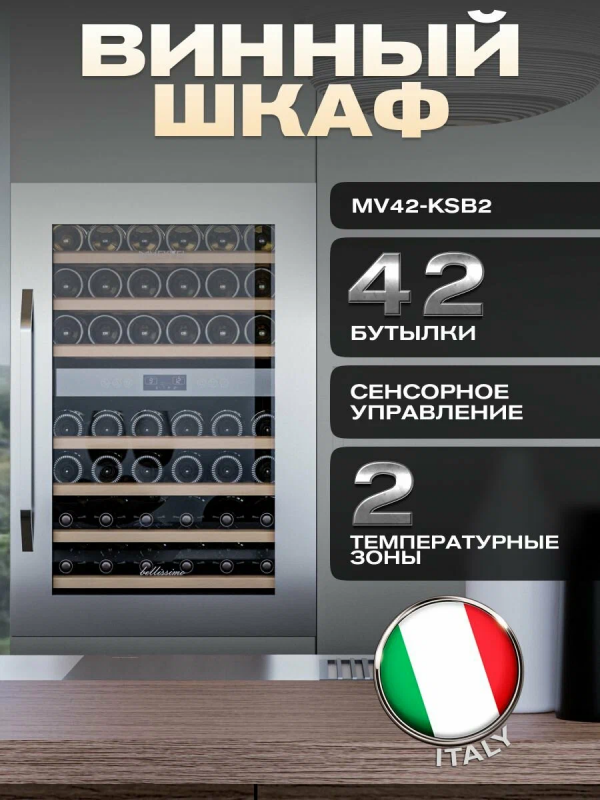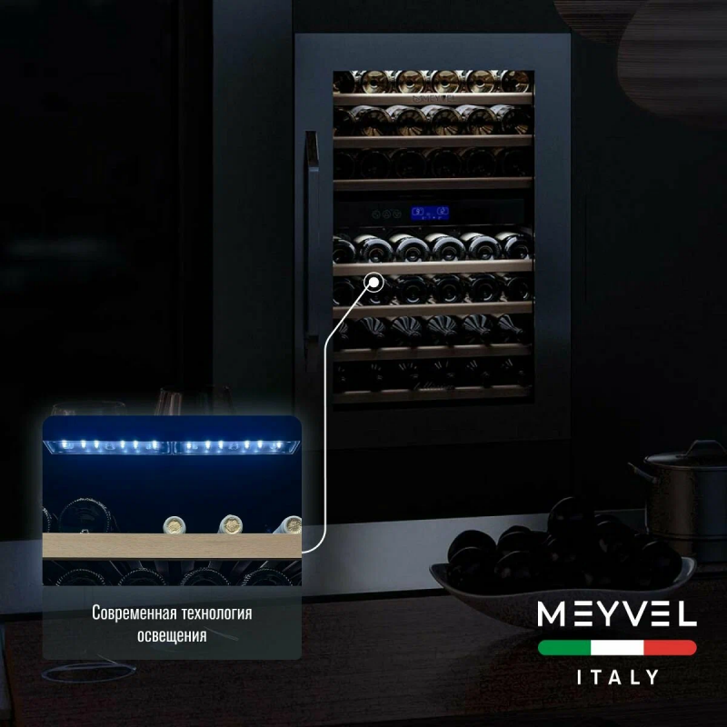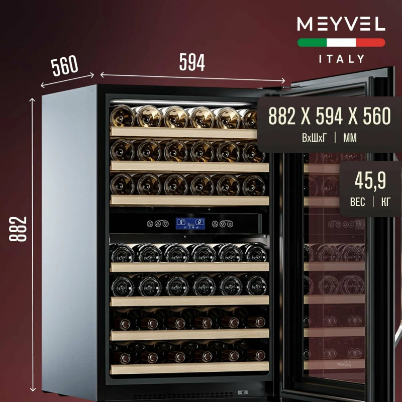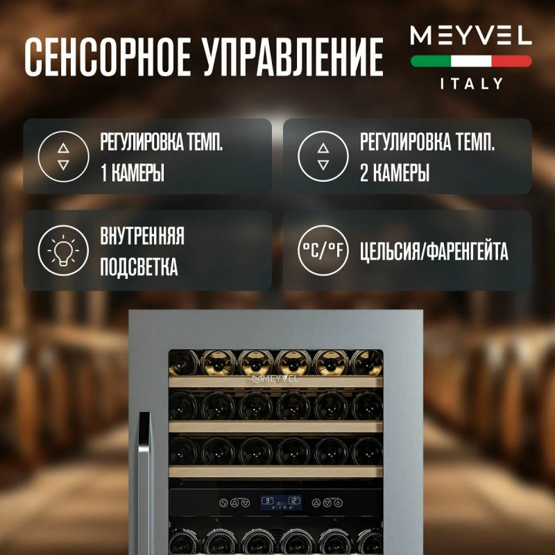 Итальянская компания MEYVEL была основана в Сицилии. Мы представляем инновационную продукцию, которая отлично подойдет для хранения любимых напитков. Так же, благодаря использованию качественных комплектующих и высокотехнологичного производства, наши товары отличаются высокой конкурентоспособностью и отличным качеством. Встраиваемый винный шкаф Meyvel MV42-KSB2 Винный шкаф MV42-KBS2 имеет привлекательный внешний вид, сочетающий в себе неподвластное времени очарование натуральных материалов с высокотехнологичными системами хранения. Винный холодильник Meyvel MV42-KSB2 оснащен дверью с защитой от ультрафиолетовых лучей и отлично подойдет для хранения и созревания различных сортов вин. Динамическая система охлаждения обеспечивает оптимальную температуру для вина и сохраняет необходимую влажность внутри камеры. Универсальный микроклимат Винный шкаф Meyvel MV42-KSB2 поддерживает оптимальную температуру и влажность воздуха, а также изолирует вина от воздействия солнечных лучей. MV42-KSB2 отлично подходит для созревания и хранения вина, так как имеет две температурные зоны: диапазон верхней от +5°C до +10°C, а нижней - от +10°C до +18°C. Сенсорное управление Быстро задавайте необходимую температуру для содержимого и управляйте всеми функциями холодильника с помощью интуитивно-понятной сенсорной панели управления. Преимущества винного шкафа Meyvel MV42-KSB2: Вместимость 42 бутылки 0,75 л; Температурный режим верхней зоны от +5°C до +10°C, нижней - от +10°C до +18°C; Память настроек; Автоматическая разморозка; Двойное стекло с УФ-фильтром; Есть возможность встроить в колонну; Выдвижные полки из массива бука. Обратите внимание: прежде чем устанавливать винный шкаф, ознакомьтесь с указанными в инструкции показателями напряжения (В) и частоты (Гц) и убедитесь в том, что они совпадают с уровнем показателей в Вашем доме; не наклоняйте винный шкаф более чем на 45°; не устанавливайте винный шкаф вблизи с нагревающимися электроприборами, а также в зоне прямого попадания солнечных лучей; необходимо установить винный шкаф по уровню и отрегулировать зазоры между дверью и мебельными фасадами, чтобы не повредить их.