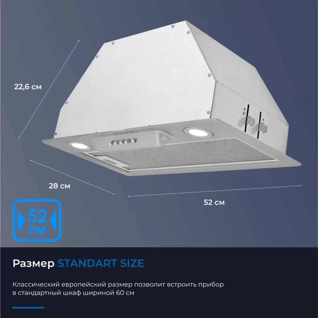 Установка: в шкаф; Тип встраивания в шкаф: полновстраиваемая; Режим работы: отвод/рециркуляция; Максимальная производительность: 850 куб. м/ч; Количество скоростей: 3; Количество двигателей: 1 шт; Мощность двигателя: 200 Вт; Материал корпуса: металл;