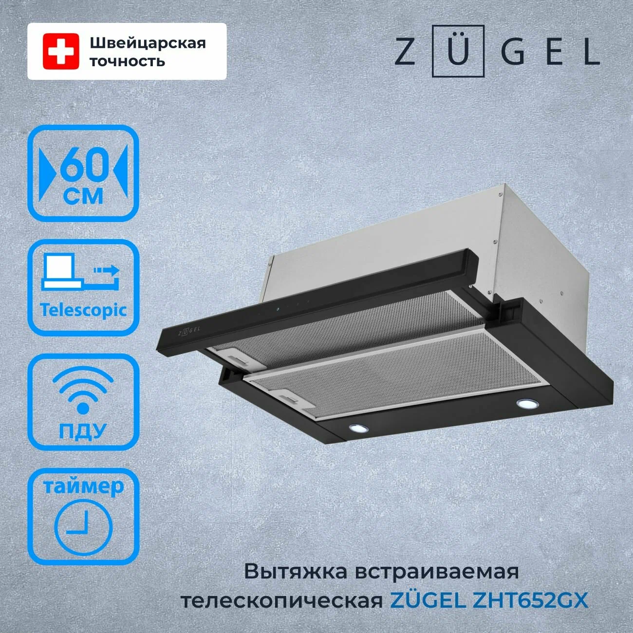 Вытяжка телескопическая Zugel ZHT652GB серии Premium Line — это эффективное и стильное решение для вашей кухни. Её передняя поверхность выполнена из стекла, корпус из металла. Модель имеет дистанционное сенсорное управление и таймер выключения. Благодаря стандартным размерам ниши для встраивания 21x60x30 см, установка вытяжки не займёт дополнительного времени и сил.Вытяжка работает в режимах отвода и рециркуляции, имеет три скорости и уровень шума 51/68 дБ, так же предусмотрена функция автоматического проветривания.Вытяжка ZUGEL Premium Line оснащена светодиодными лампами, которые отличаются долгим сроком службы и низким энергопотреблением, обеспечивая хорошее освещение в темное время суток. Она также оснащена двумя алюминиевыми фильтрами, которые эффективно задерживают частицы жира, что способствует чистому воздуху. Рекомендуется регулярно очищать фильтры, чтобы поддерживать их эффективность. Диаметр штуцера - 120/150 мм.