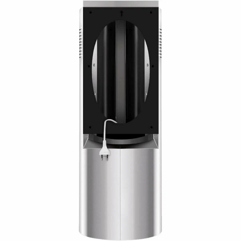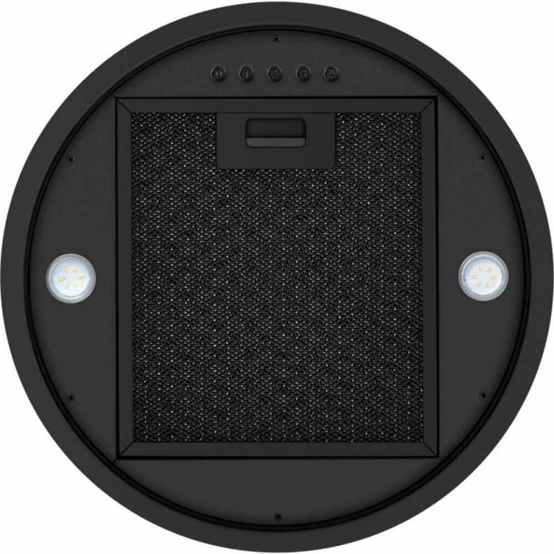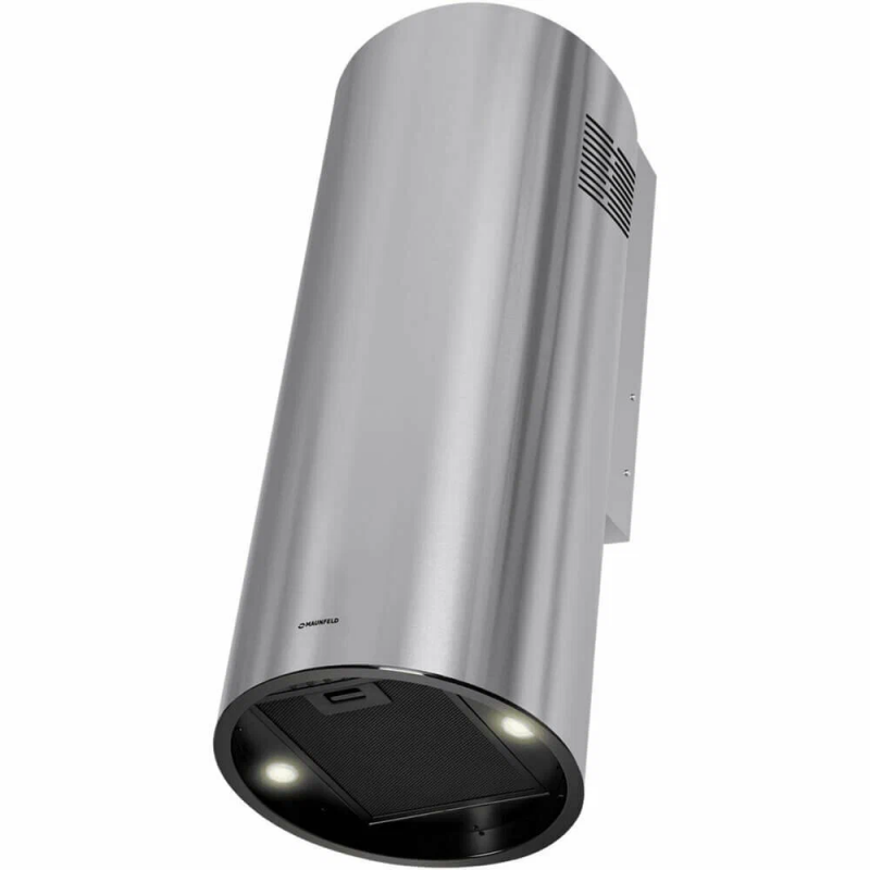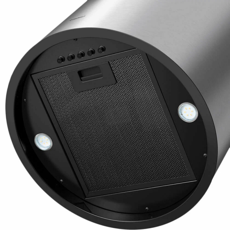 Корпус цилиндрической формы, выполненный из нержавеющей стали с термостойким покрытием черного цвета, устанавливается на стену над поверхностью плиты. Алюминиевый многослойный жироулавливающий фильтр находится в нижнем торце вытяжки.