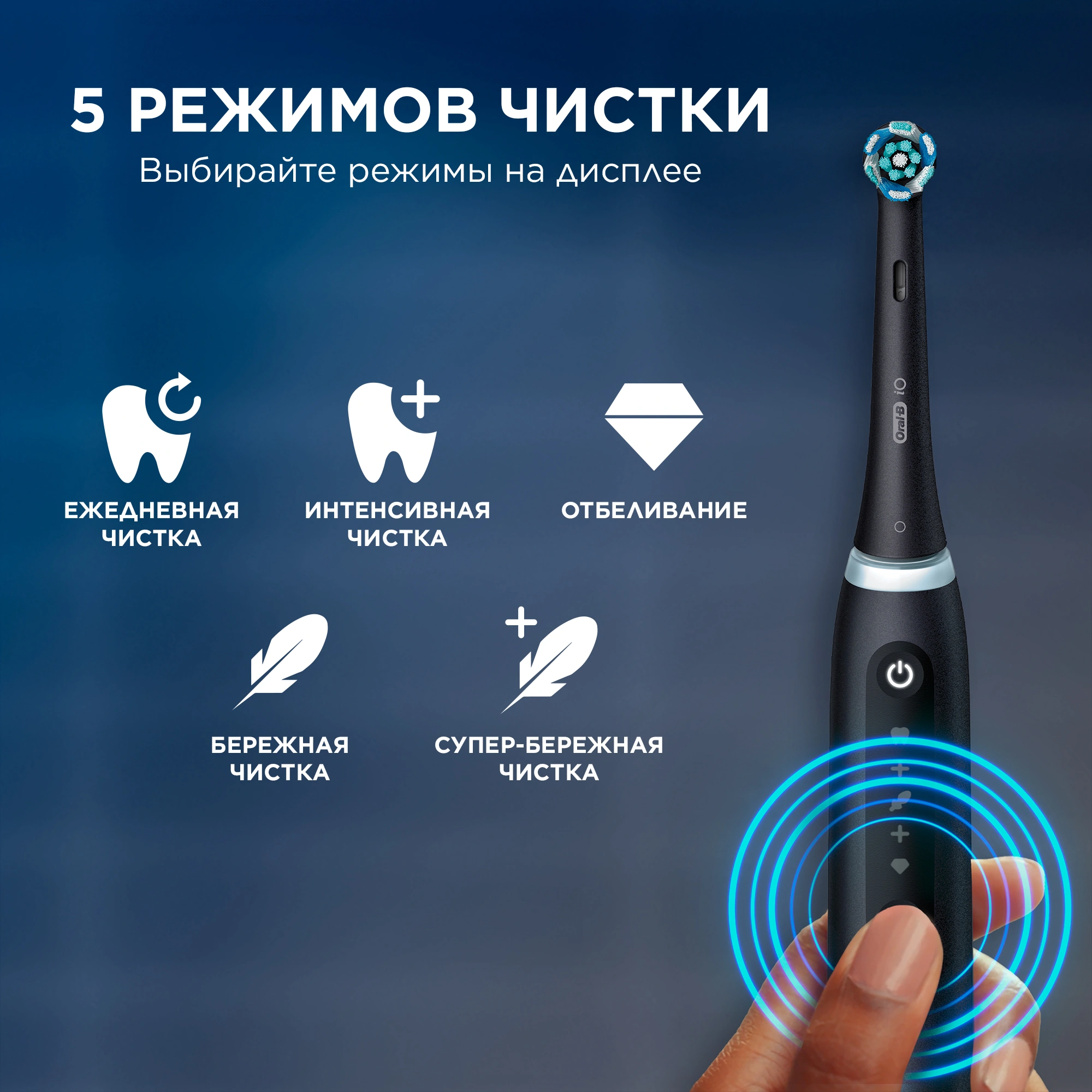 Интерактивный черно-белый дисплей отображает важную информацию и позволяет выбирать между 5 режимами чистки. Разработанная со стоматологами круглая насадка электрической зубной щетки Оral-B профессионально очищает с помощью технологии возвратно-вращательных движений и микровибраций. Умный датчик давления зубной щетки в футляре сигнализирует красным световым сигналом о чрезмерном надавливании и зеленым — о правильной чистке. Интерактивный дисплей зубной щетки средней жесткости отображает и позволяет выбирать между 5 режимами чистки, информацию об износе сменной насадки и 2-минутный таймер, обеспечивая уникальную персонализированную процедуру чистки. iO сочетает в себе уникальную круглую насадку Oral-B с бережной энергией очищения микровибрирующих щетинок.