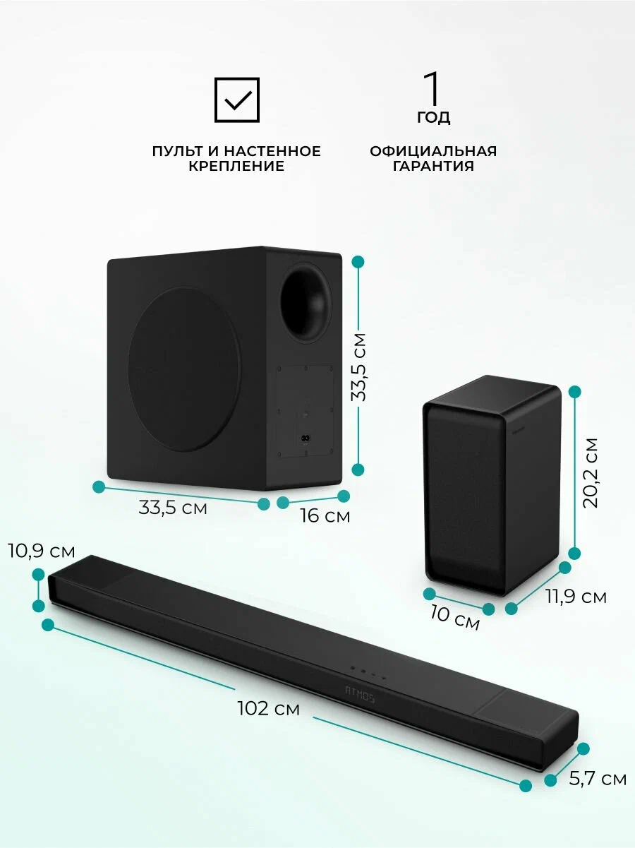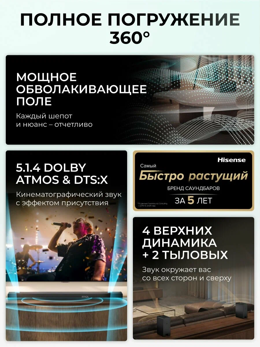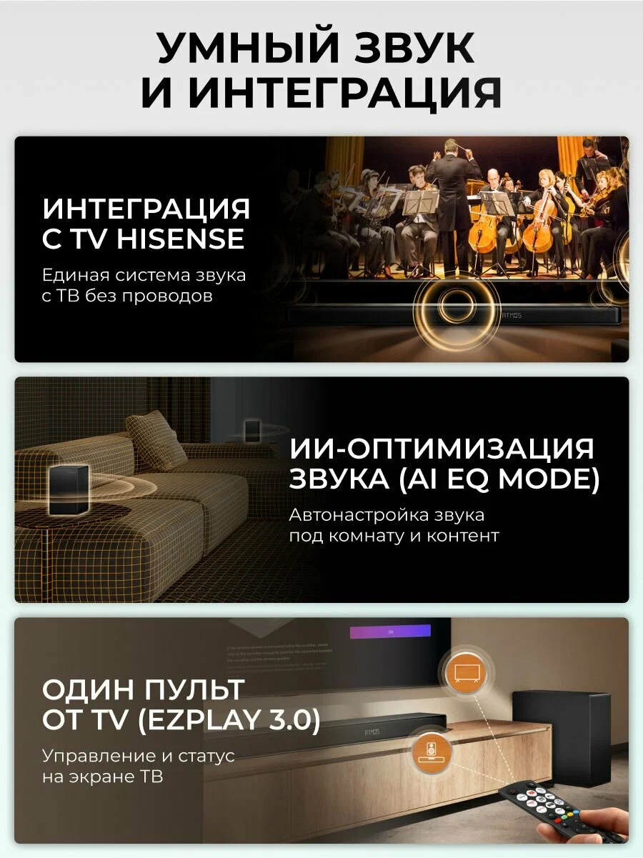 Саундбар Hisense AX5140Q - 5.1.4-канальный звук с поддержкой технологий Dolby Atmos и DTS: X. Четыре направленных вверх динамика формируют звуковой оазис с охватом в 360°, окружающий слушателей со всех сторон. С двумя направленными вверх тыловыми колонками системы окружающего звучания достигается полноценный обволакивающий эффект. Наслаждайтесь объемным звучанием, которое заполняет все доступное пространство.Режим эквалайзера AI EQ Mode, работающий на основе передовых ИИ-алгоритмов, устраняет искажения, повышает четкость и формирует захватывающие звуковые ландшафты для каждого сюжета.Объемный звук одновременно от телевизора и саундбара. С технологией Hi-Concerto оба устройства действуют в тандеме, выстраивая атмосферу домашнего кинотеатра без лишних кабелей и аппаратуры. C помощью встроенной в телевизор Hisense ИИ-технологииоптимизируйте звук в соответствии с особенностями планировки. Индивидуальное звучание достигается за счет плавной адаптации к пространству и точности воспроизведения.Легко меняйте режимы саундбара с помощью пульта от телевизора Hisense, чтобы оптимизировать диалоги и музыкальное сопровождение. Благодаря EzPlay 3.0 на экране ТВ в реальном времени отображается статус беспроводного динамика, значительно упрощая управление.